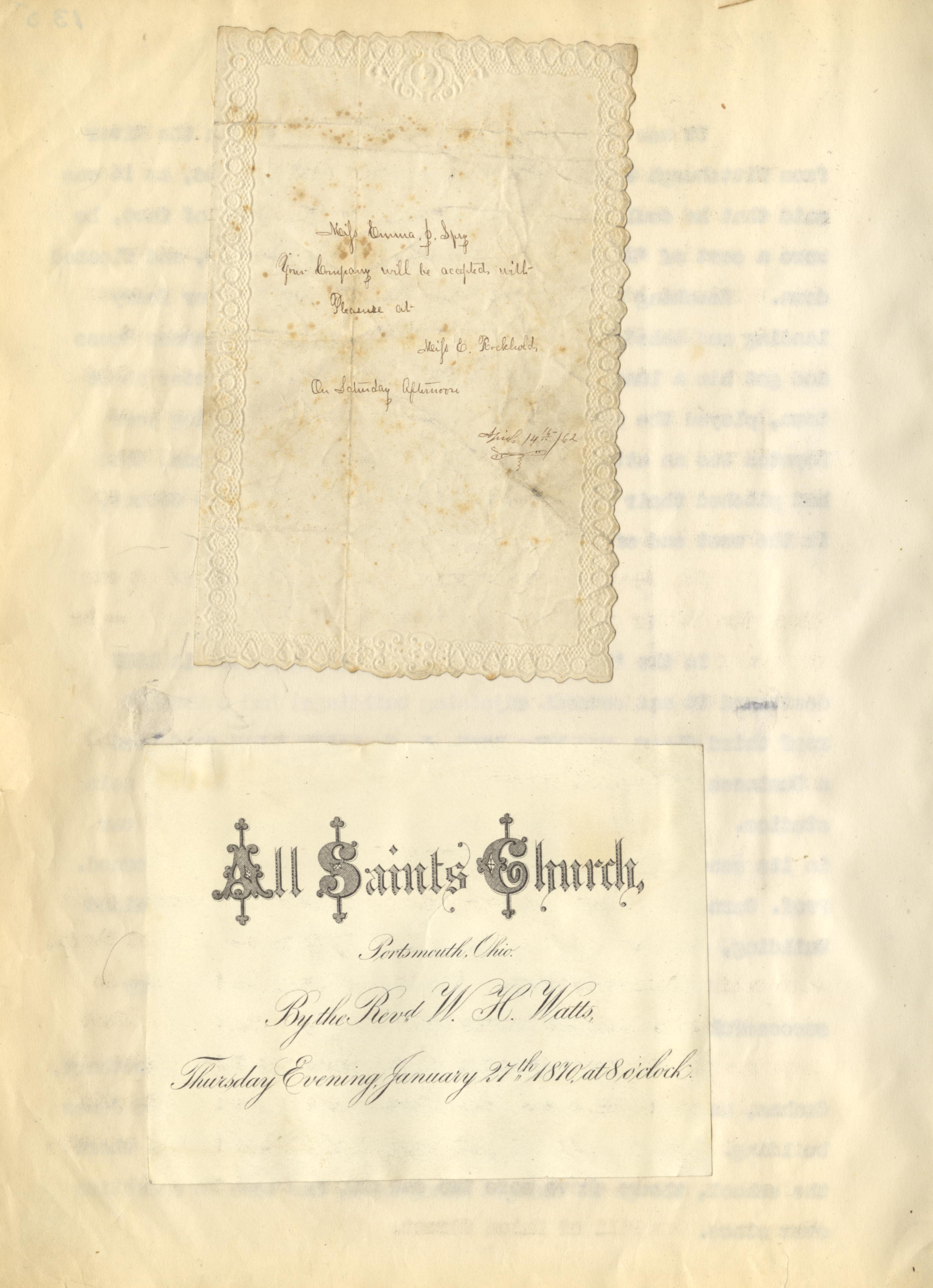 - Scanned unnumbered page from Henry A. Lorberg scrapbook containing a handwritten letter requesting a visit from Emma Spry. Printed invitation to All Saints Church.