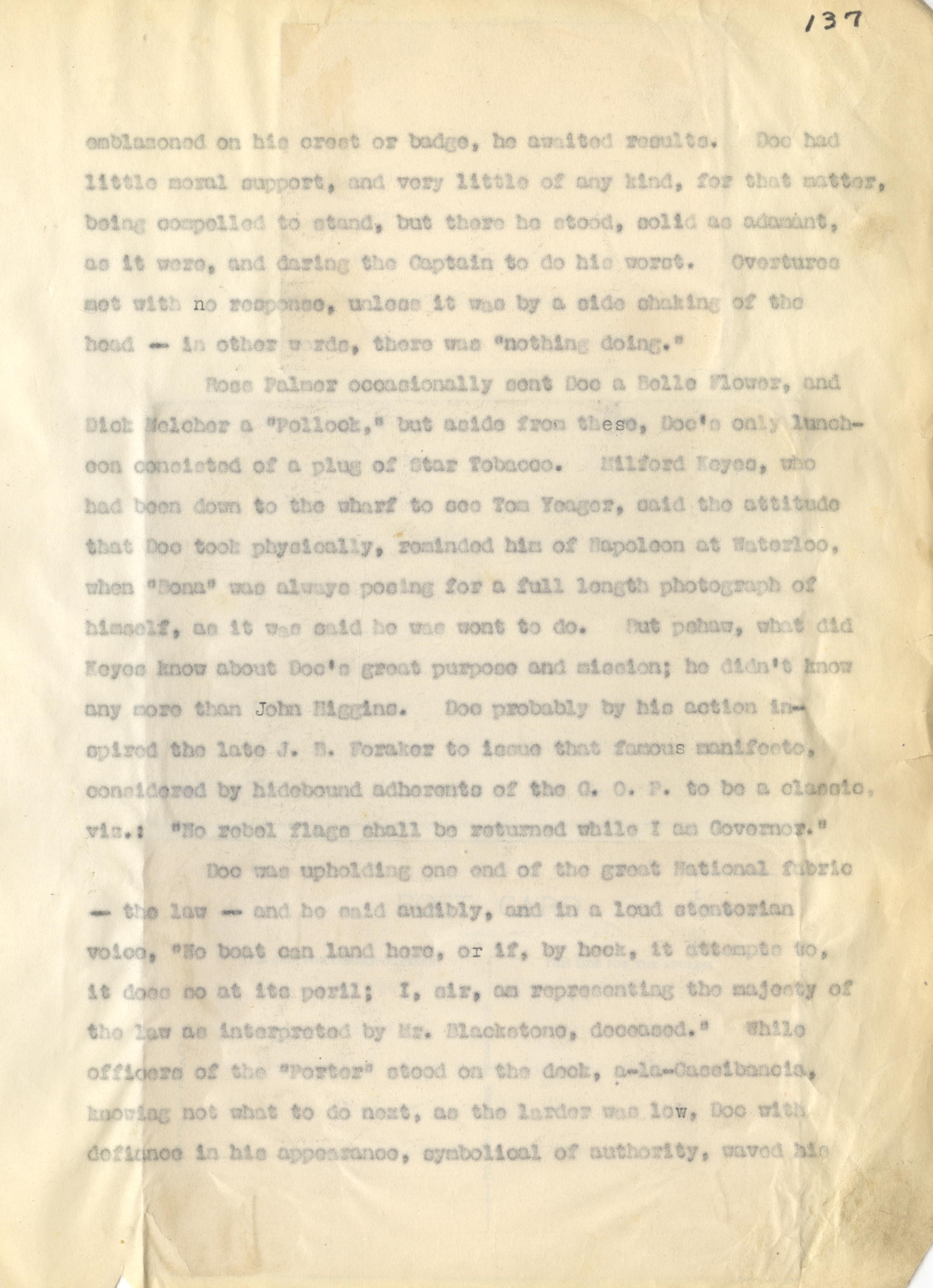 - Scanned page 137 from Henry A. Lorberg scrapbook containing a typed text narrative about "Doc" who prevented a boat from landing at Portsmouth.