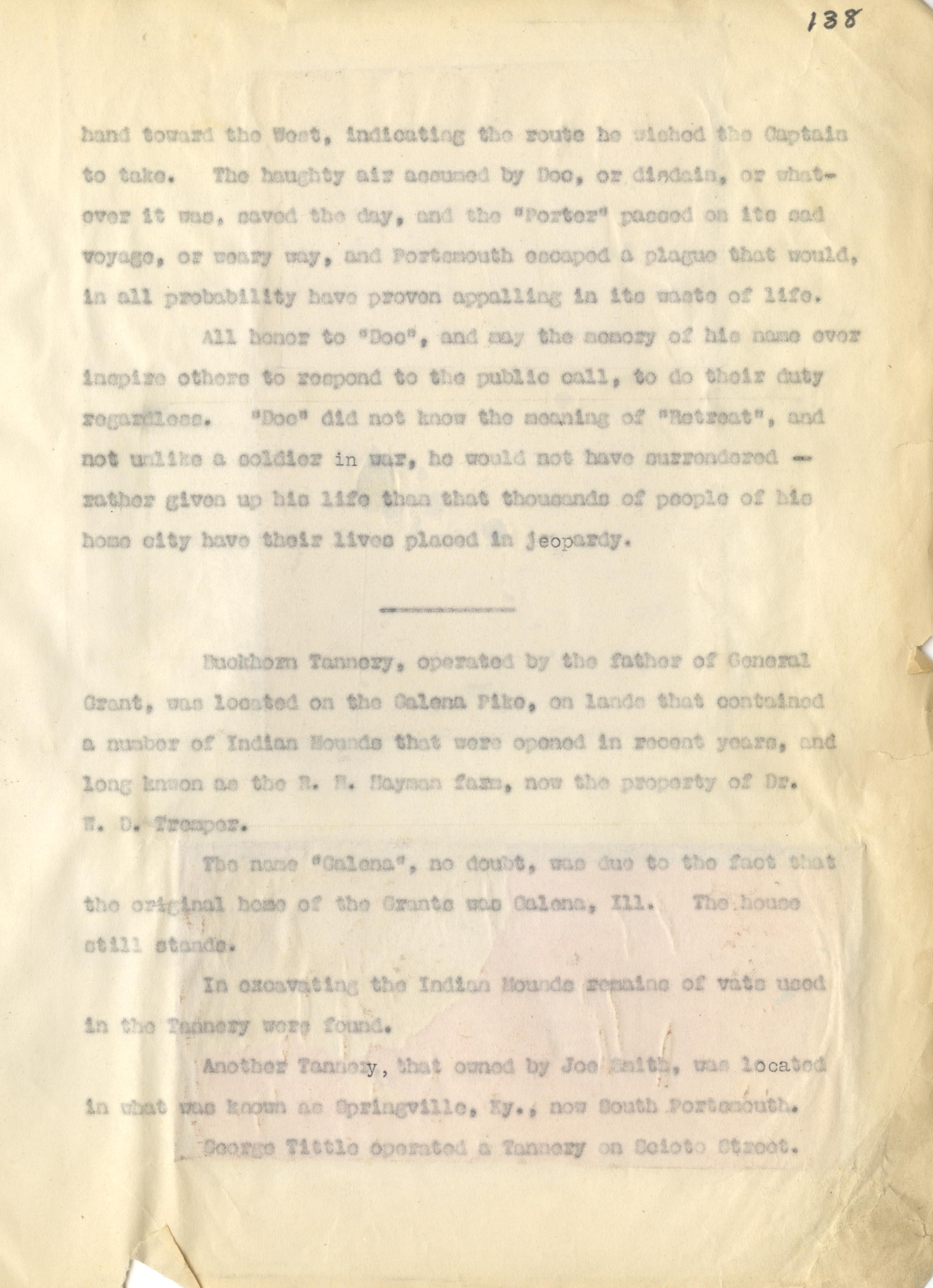 - Scanned page 138 from Henry A. Lorberg scrapbook containing a typed text narrative about "Doc" who prevented a boat from landing at Portsmouth; and Buckhorn Tannery, operated by the father of General Grant on Galena Pike.