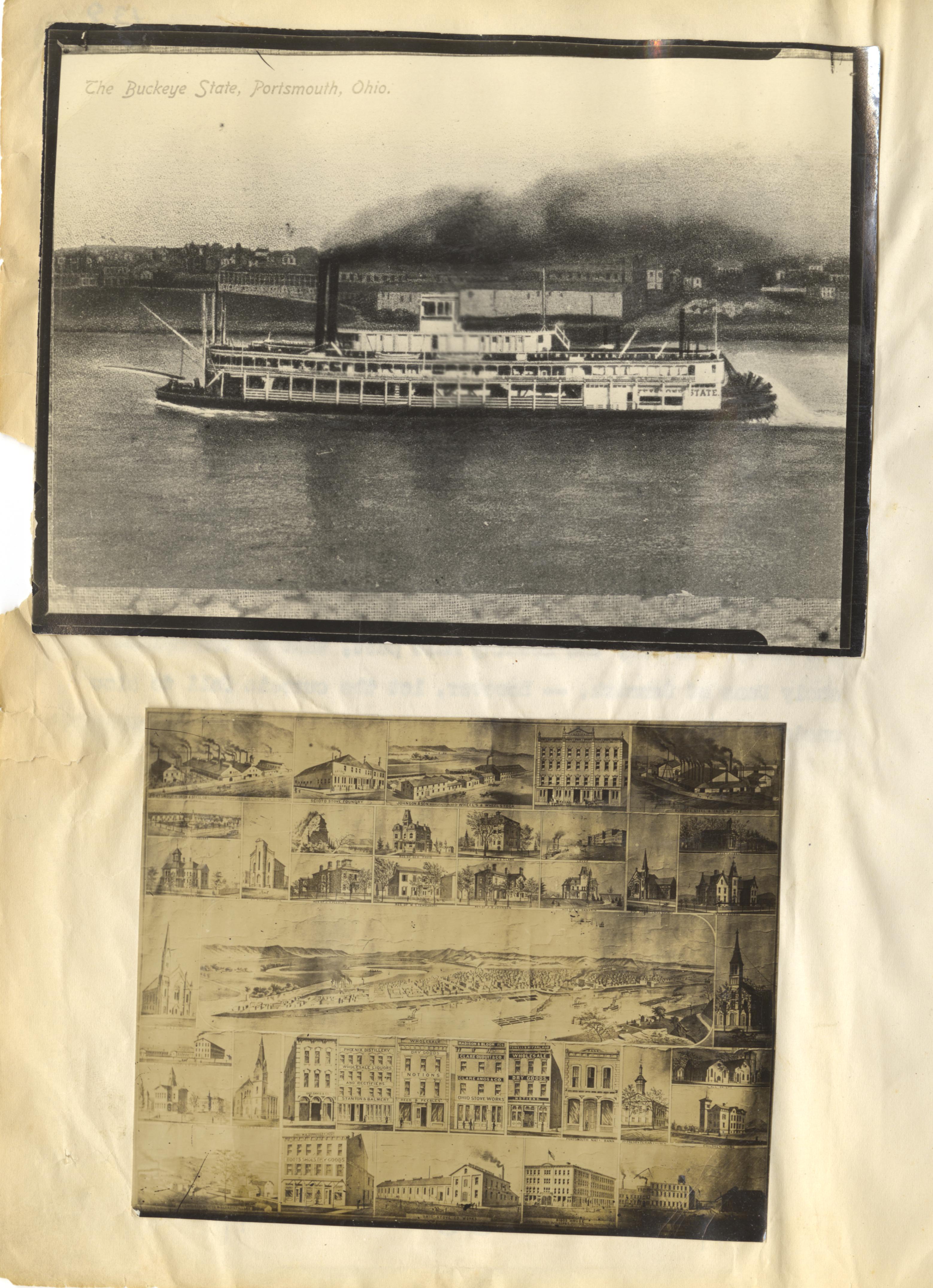 - Scanned unnumbered page from Henry A. Lorberg scrapbook containing a black & white image of The Buckeye State steamboat and a city map of Portsmouth with local buildings and churches creating a border around the map