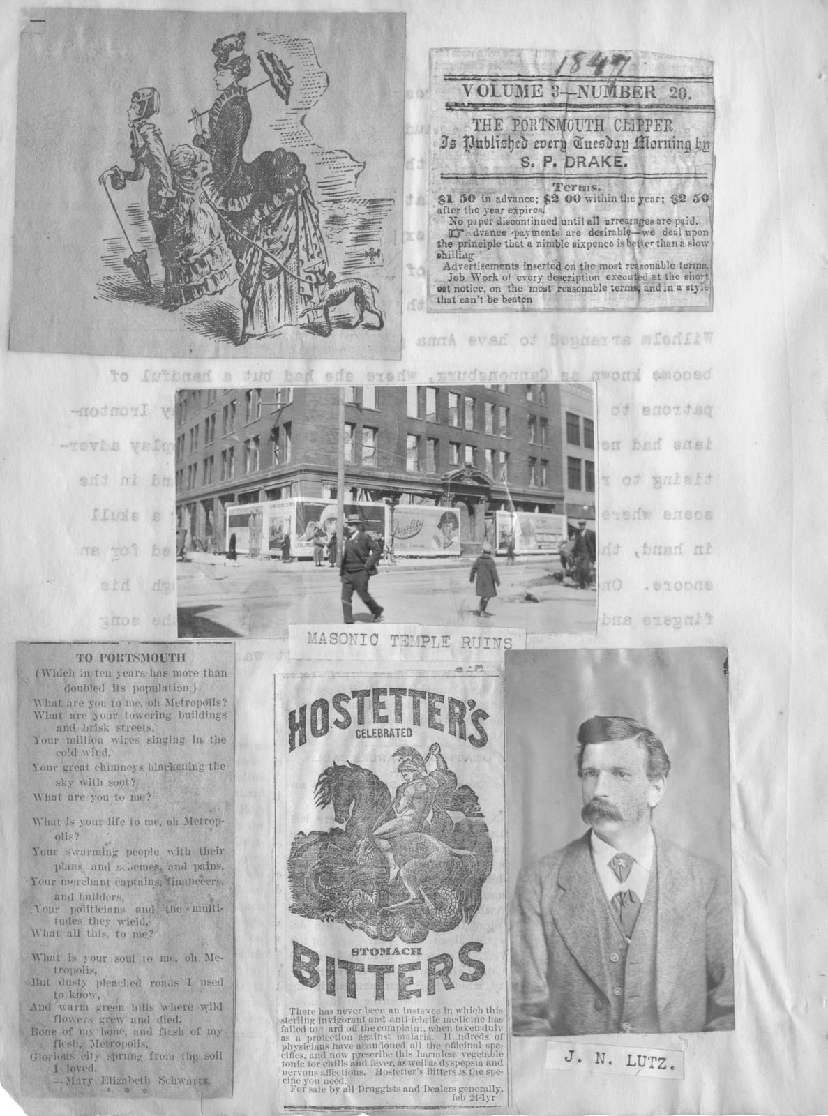 - Scanned unnumbered page from Henry A. Lorberg scrapbook containing black & white illustration of two women walking a dog; a clipping about The Portsmouth Clipper, S. P. drake; a black & white image of the Masonic Temple Ruins after the fire in December 1925 on Chillicothe at corner of Fourth (4th) Street; a print clipping about Portsmouth by Mary Elizabeth Schwartz; a clipped ad for Hobstetter's Celebrated Stomach Bitters; and a black & white image of J. N. Lutz