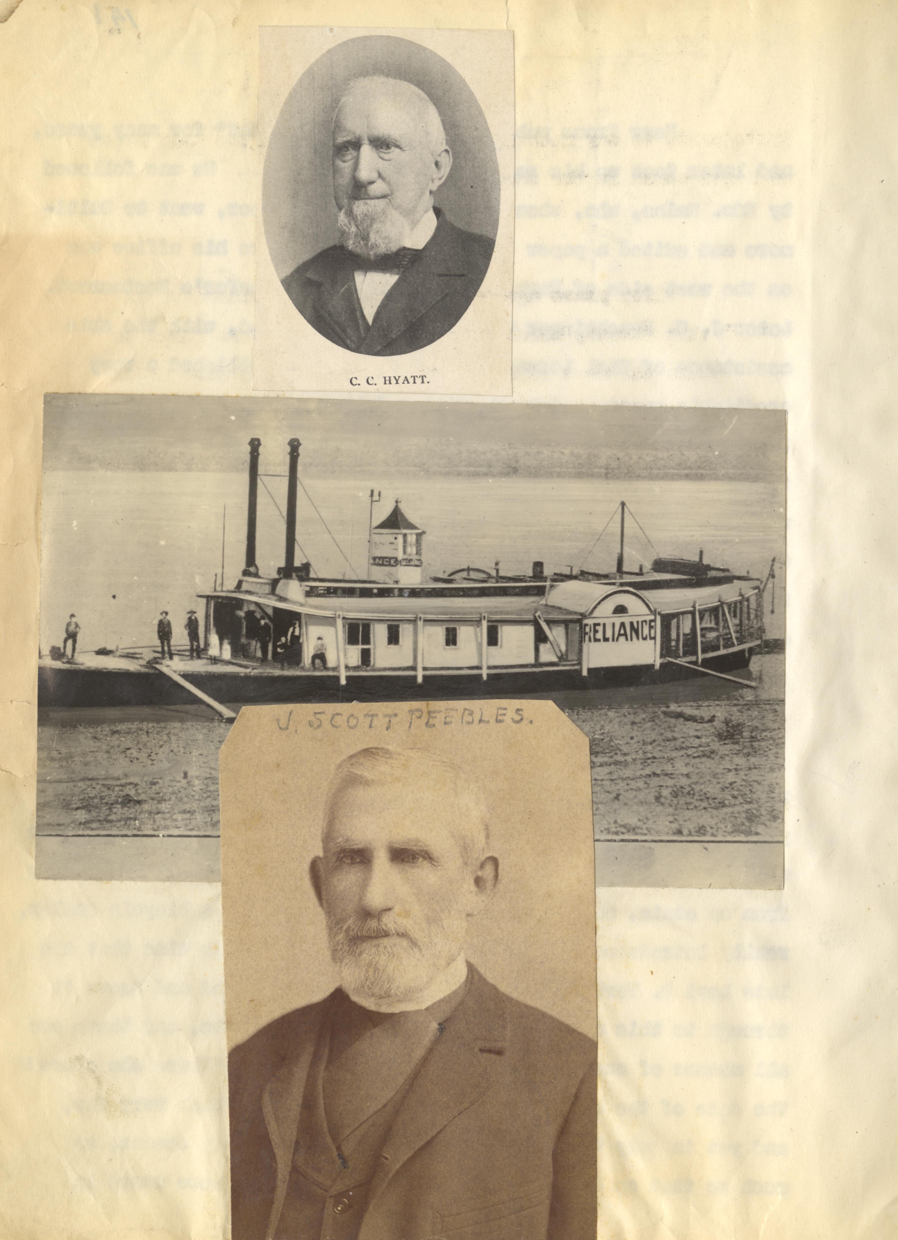- Scanned unnumbered page from Henry A. Lorberg scrapbook containing black & white images of C. C. Hyatt; Reliance Steamboat; J. Scott Peebles.