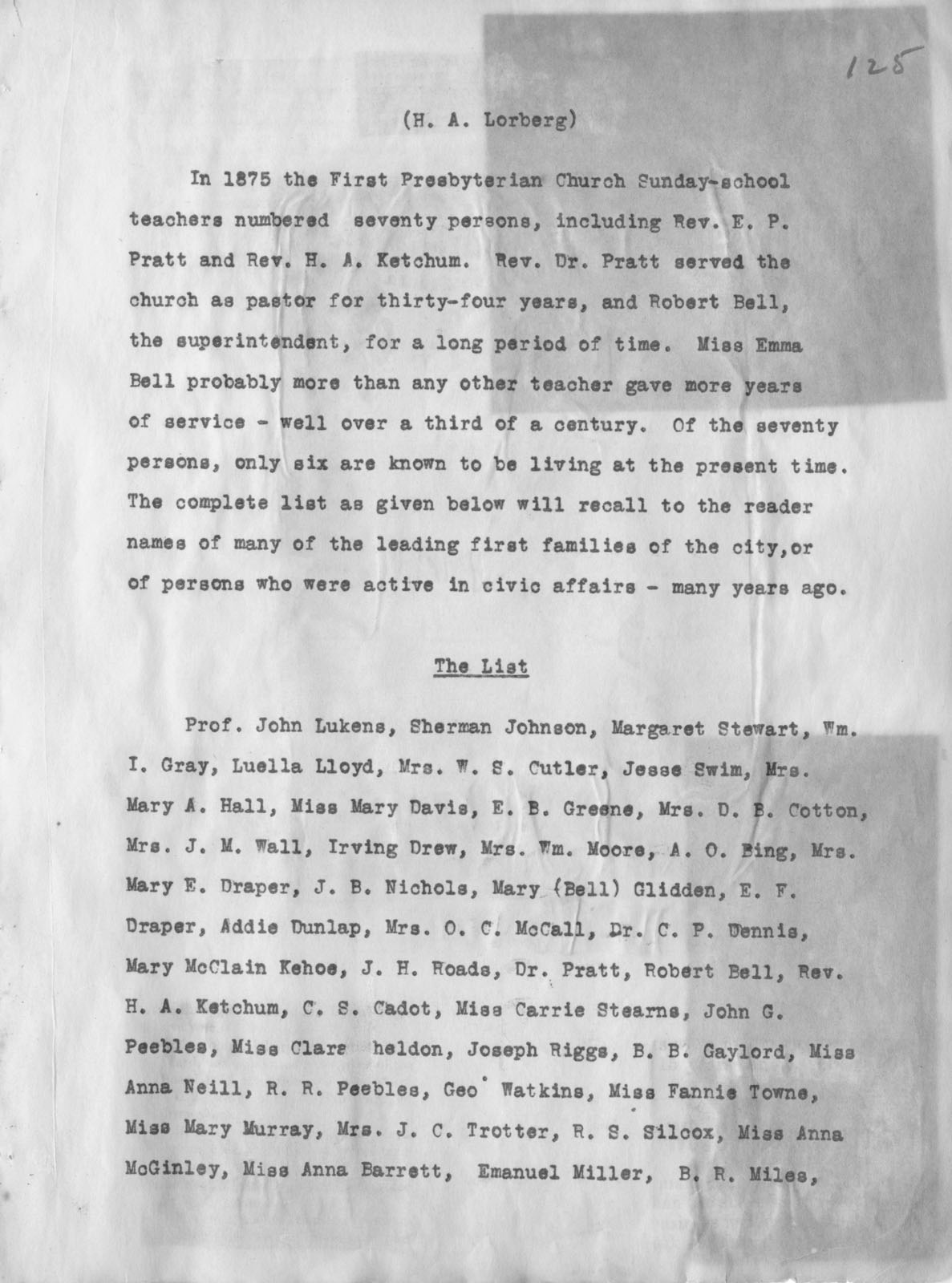 - Scanned page 125 from Henry A. Lorberg scrapbook containing typed text discussing and listing the Sunday-school teachers at First Presbyterian Church.