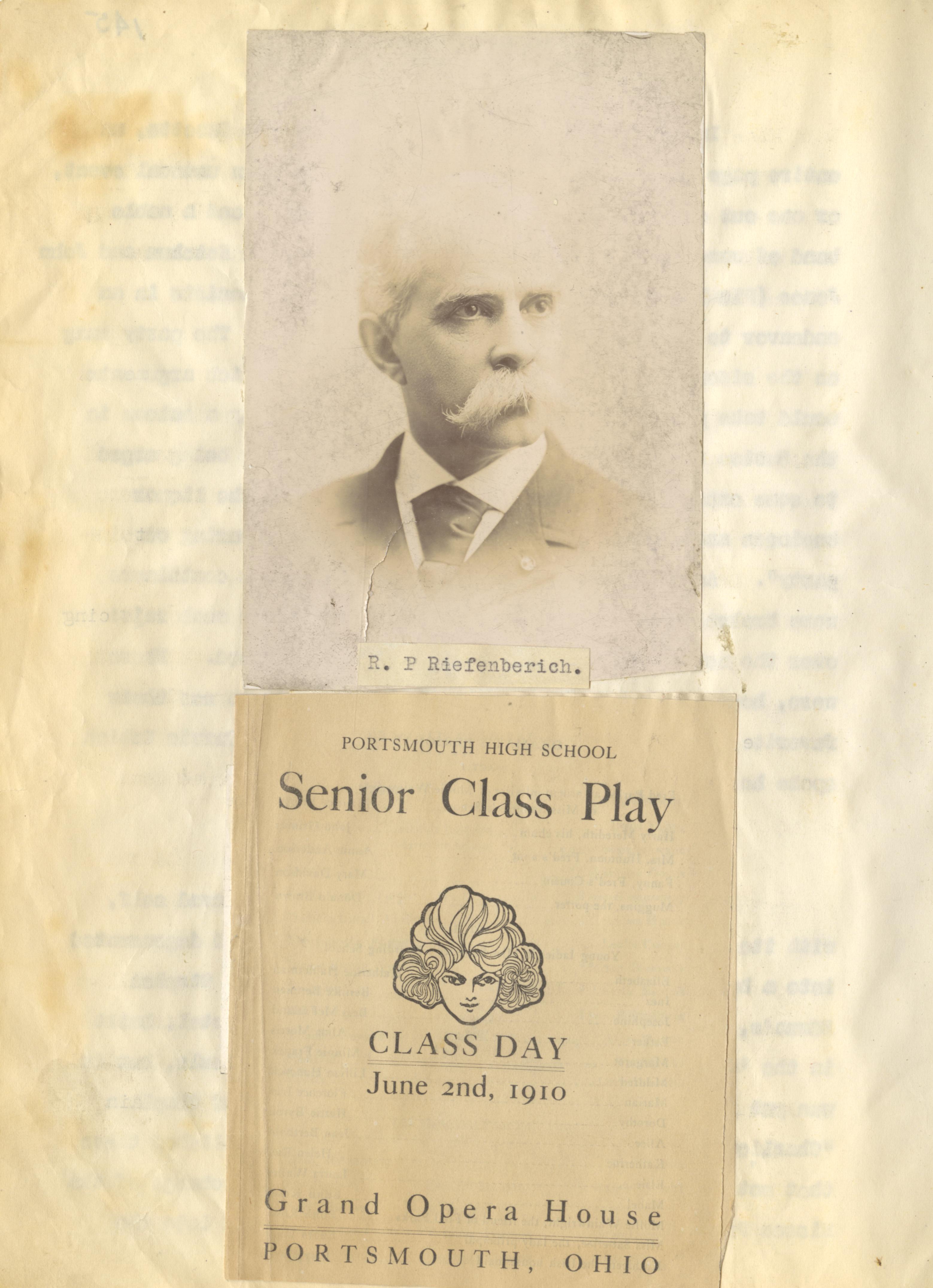 - Scanned unnumbered page from Henry A. Lorberg scrapbook containing a black & white image of R. P. Reifenberich and a printed flyer for a Senior Class Play for Portsmouth High School at the Grand Opera House.