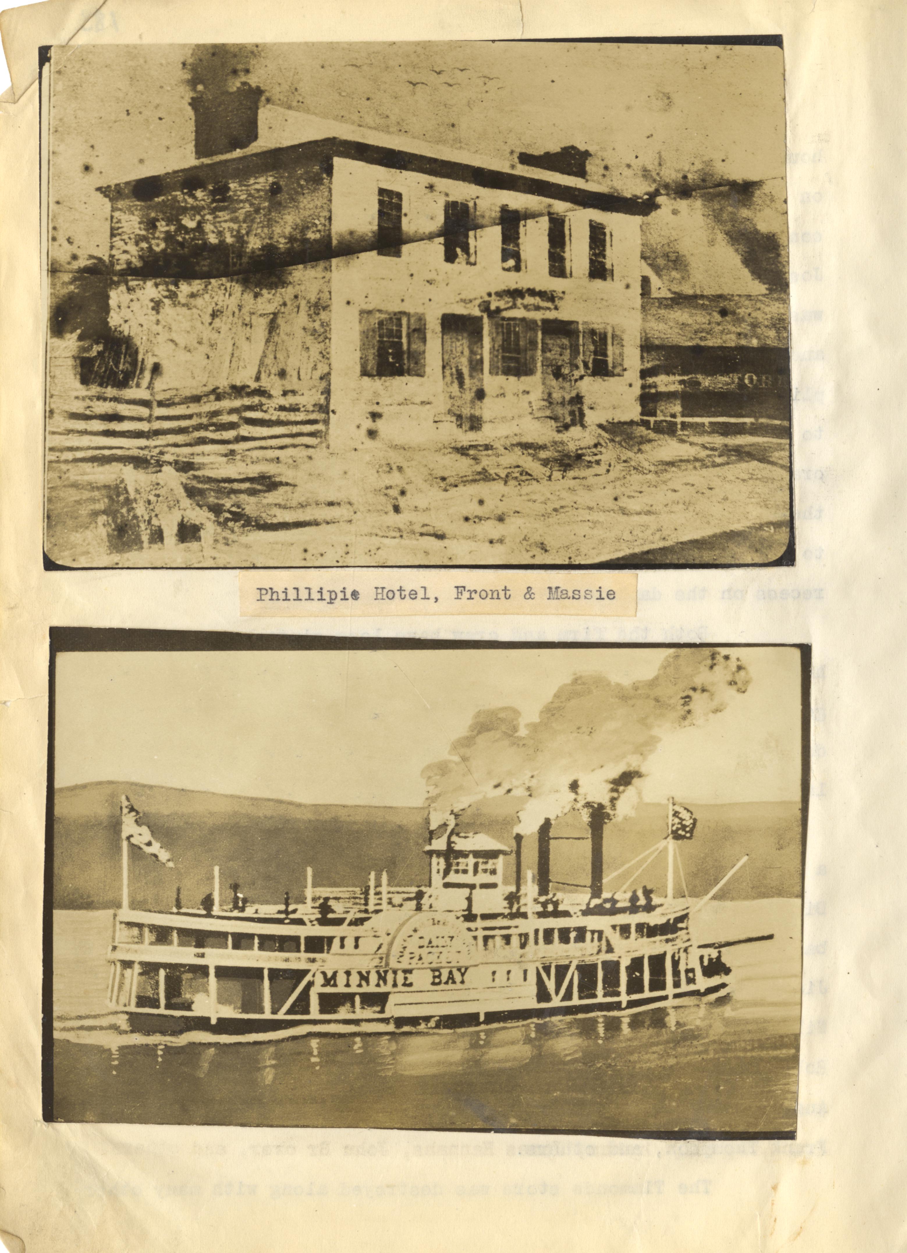 - Scanned unnumbered page from Henry A. Lorberg scrapbook containing black & white images of Phillipie Hotel at Front & Massie; the Minnie Bay steamboat on the river.
