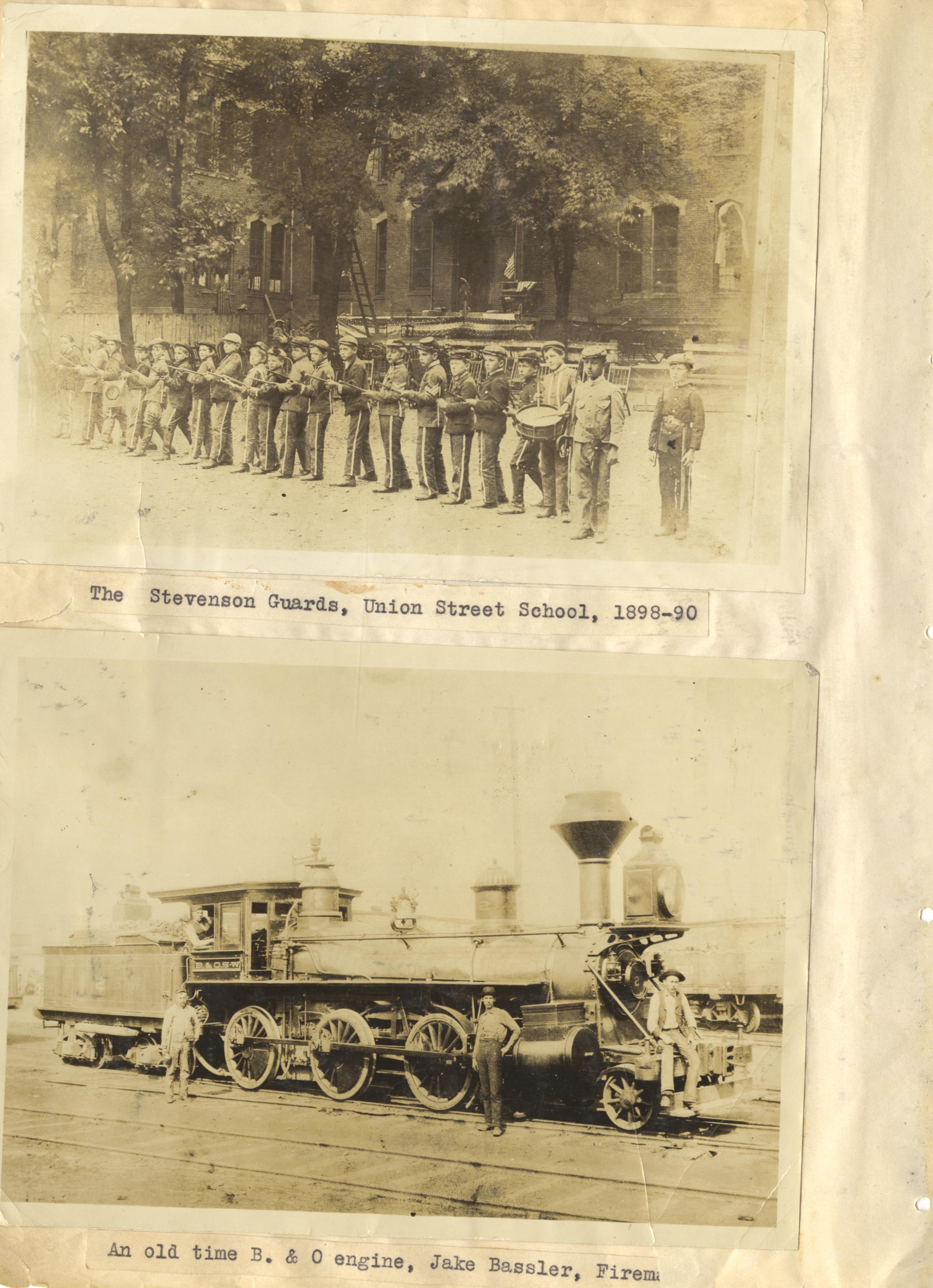 - Scanned unnumbered page from Henry A. Lorberg scrapbook containing black & white images of Stevenson Guards, Union Street School; Old Time B. & O. Engine, Jake Bassler, fireman.