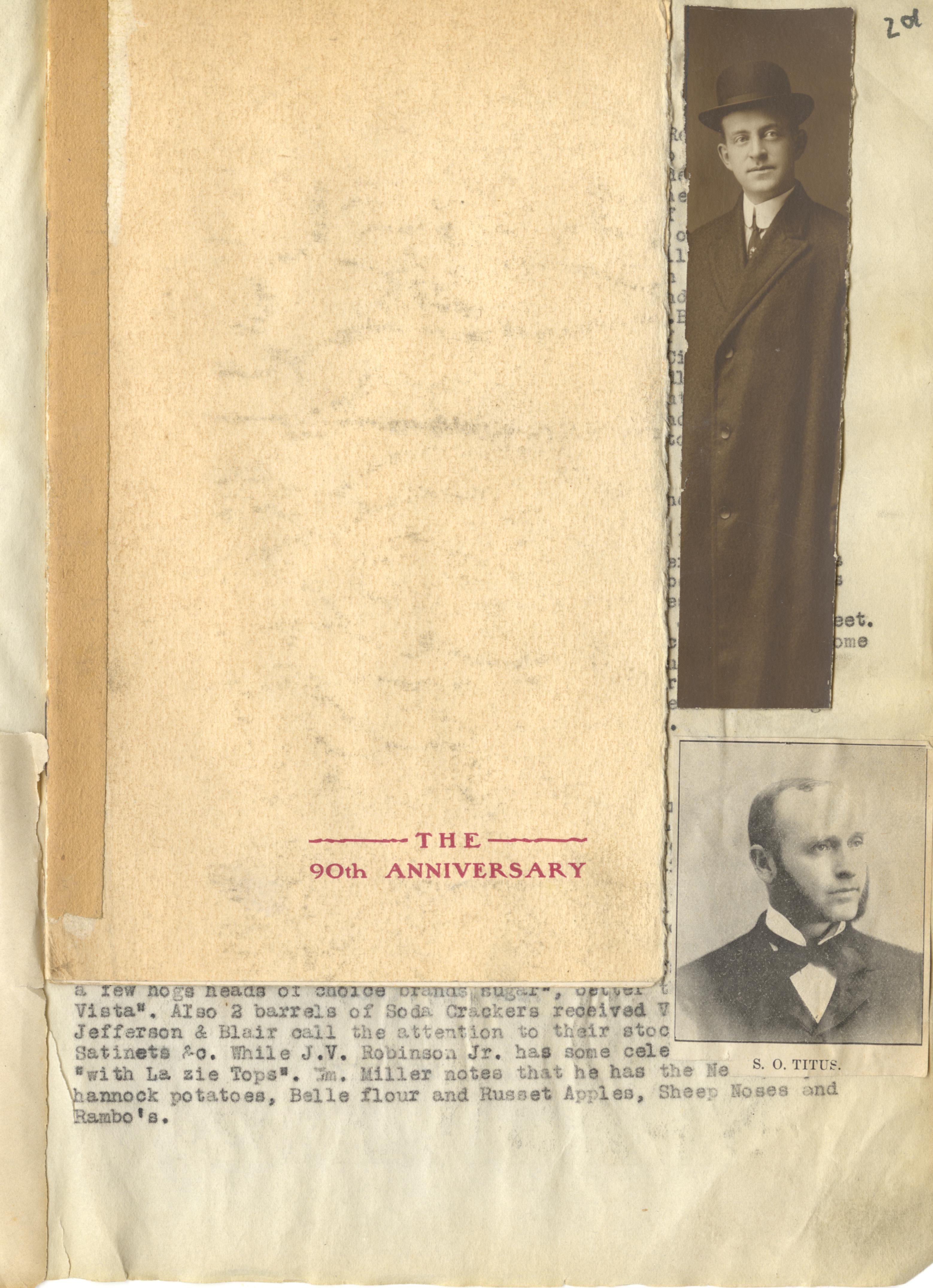 - Scanned page 201 from Henry A. Lorberg scrapbook containing a tan colored cover that reads The 90th Anniversary in red text; an image of an unidentified man; a black & white image of S. O. Titus.