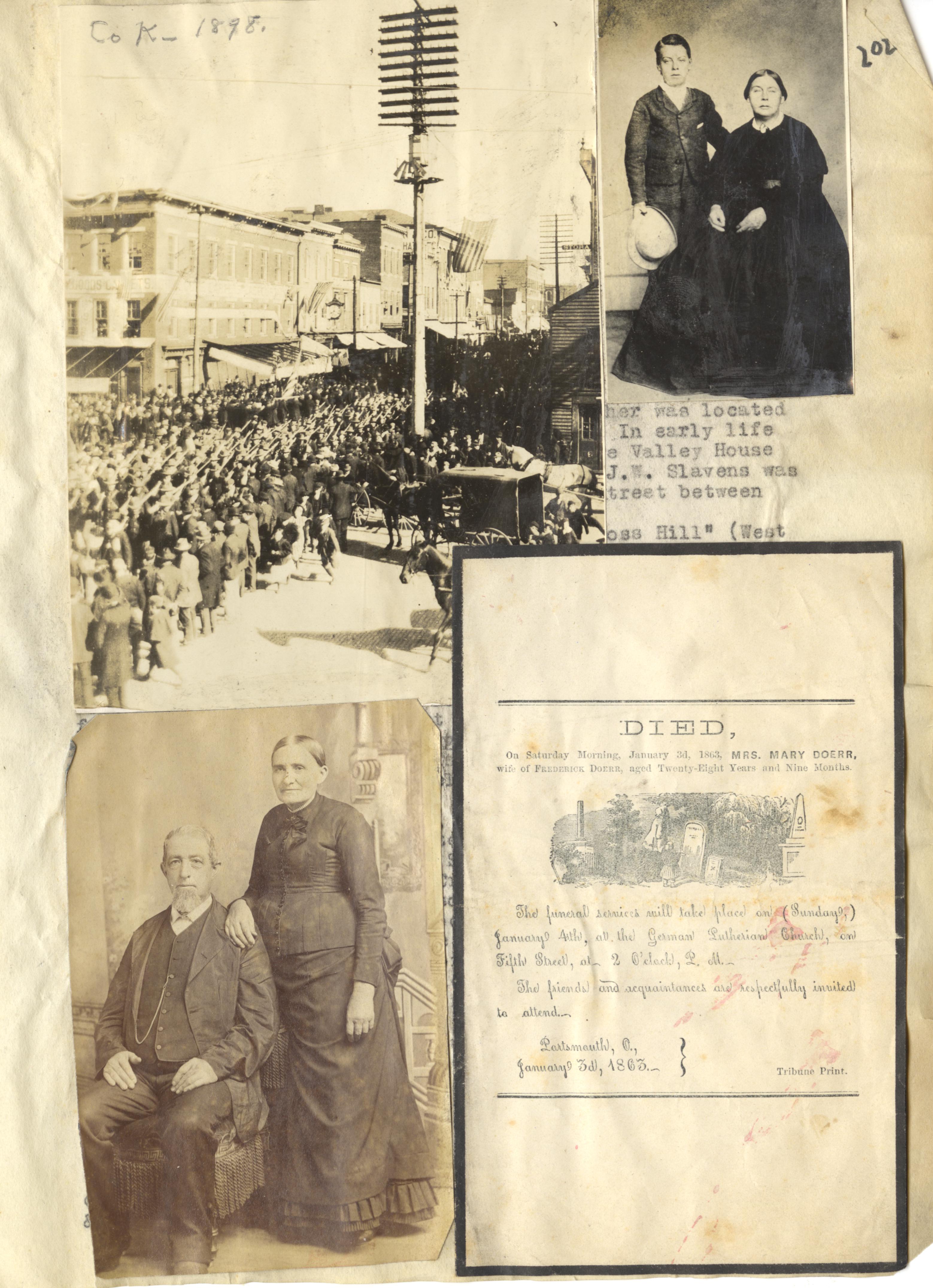 - Scanned page 202 from Henry A. Lorberg scrapbook containing black & white images of Company K. in 1898; and two unidentified couples; a death announcement for Mary Doerr.