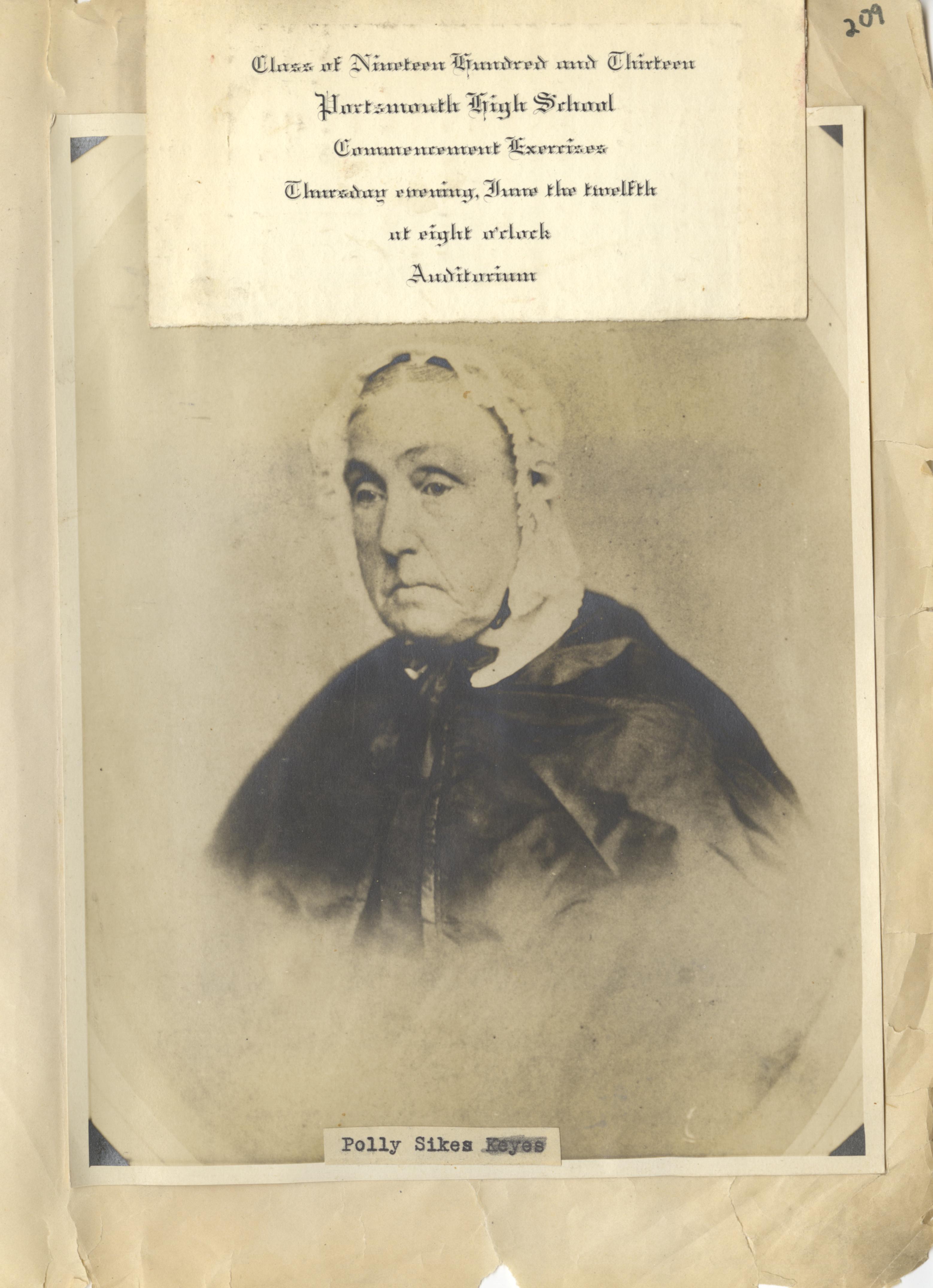- Scanned page 209 from Henry A. Lorberg scrapbook containing an invitation to the 1913 Portsmouth High School Commencement Exercises; black & white image of Polly Sikes.
