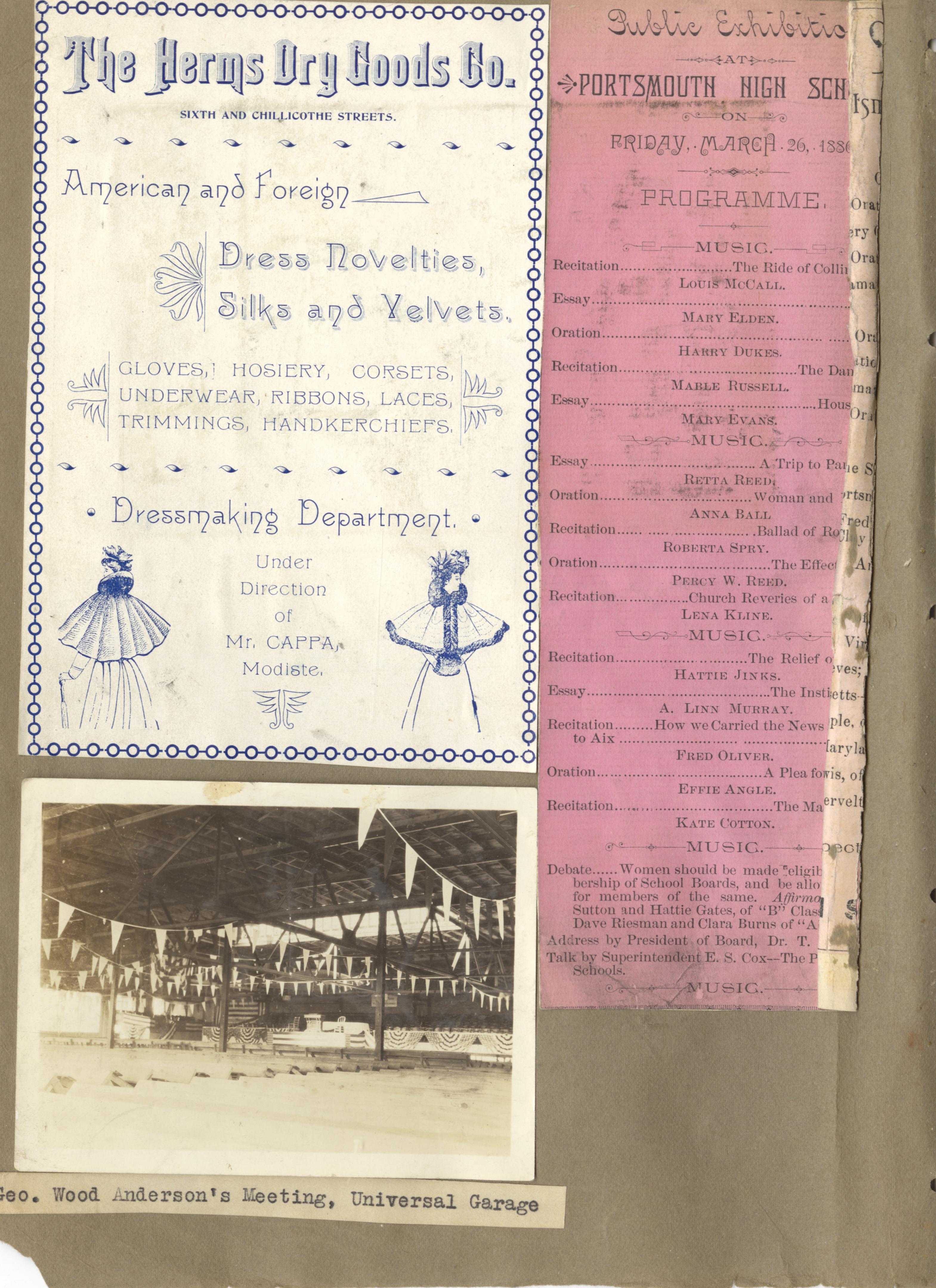 - Photo image of scanned scrapbook page showing the Herms Dry Goods Co. Advertisement for their dressmaking department on Sixth and Chillicothe Streets. The Portsmouth High School Program on Friday March 26, 1886 that talks about a debate that discussed that women should be made eligible to be members of the school board. A photo of George Wood Anderson's Meeting, Universal Garage.