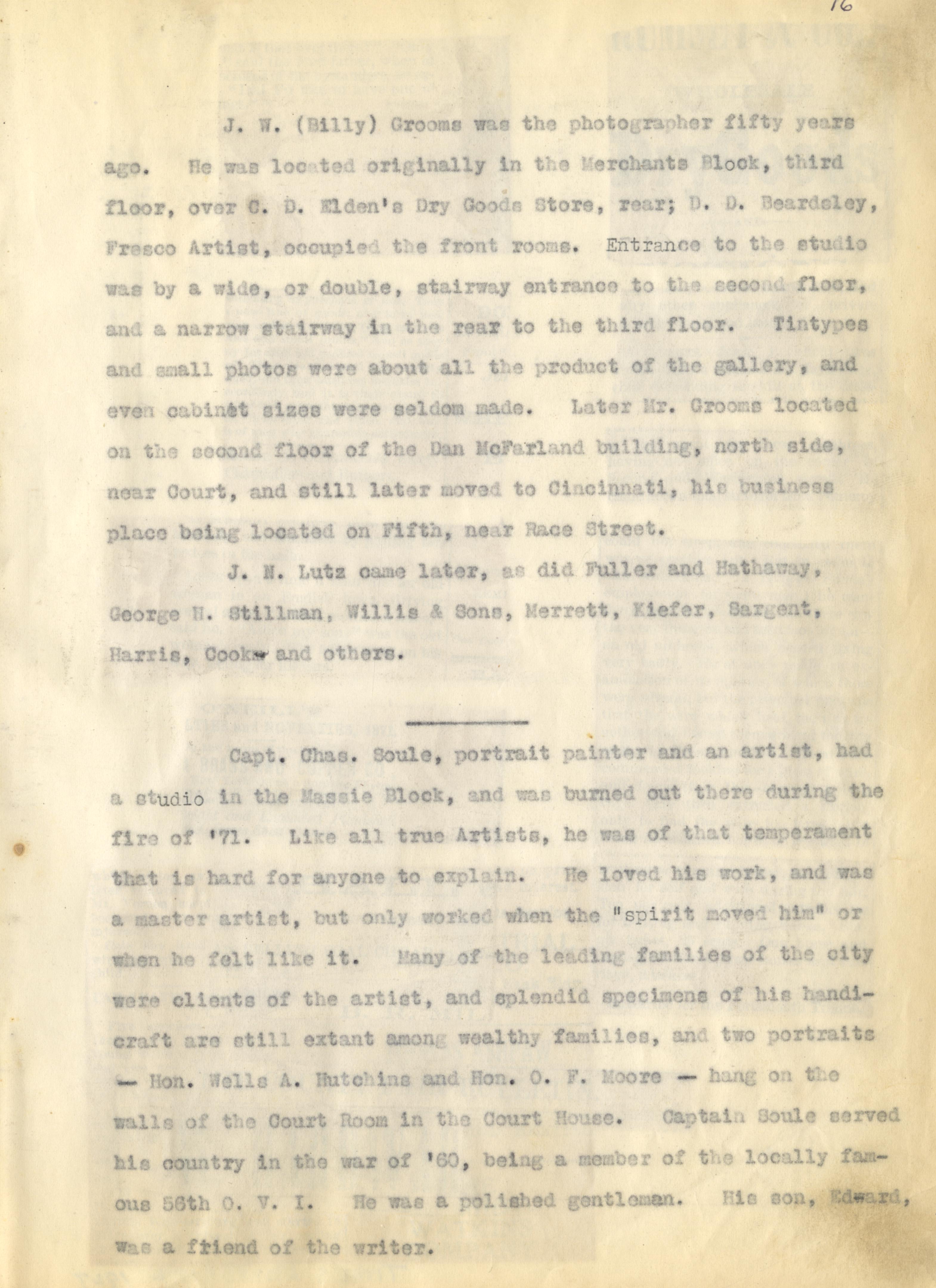 - Photo image of scanned scrapbook page. Pictured is a typed page separated into two sections. The first is about J. W. (Billy) Grooms (Groomes), a local photographer who originally had a studio in the Merchants Block. The second portion of the page is devoted to Captain Charles Soule, an artist who had a studio in the Massie Block