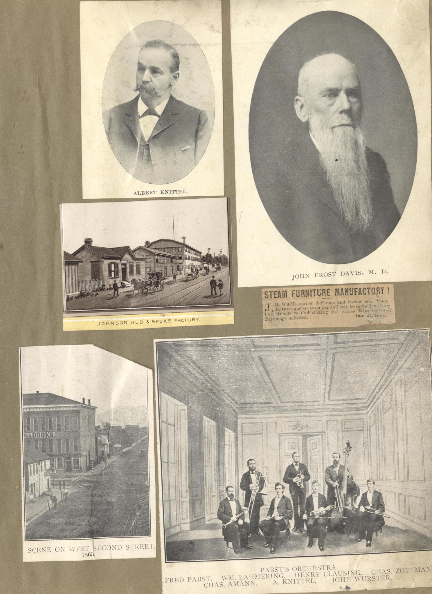 - Photo image of scanned scrapbook page. Pictured: Albert Knittel; John Frost Davis, M. D.; Johnson Hub & Spoke Factory; Scene on West Second (2nd) Street, 1865; Pabst Orchestra: Fred Pabst, William Lahmering, Henry Clausing, Charles Zottman, Charles Amann, A. Knittel, John Wurster