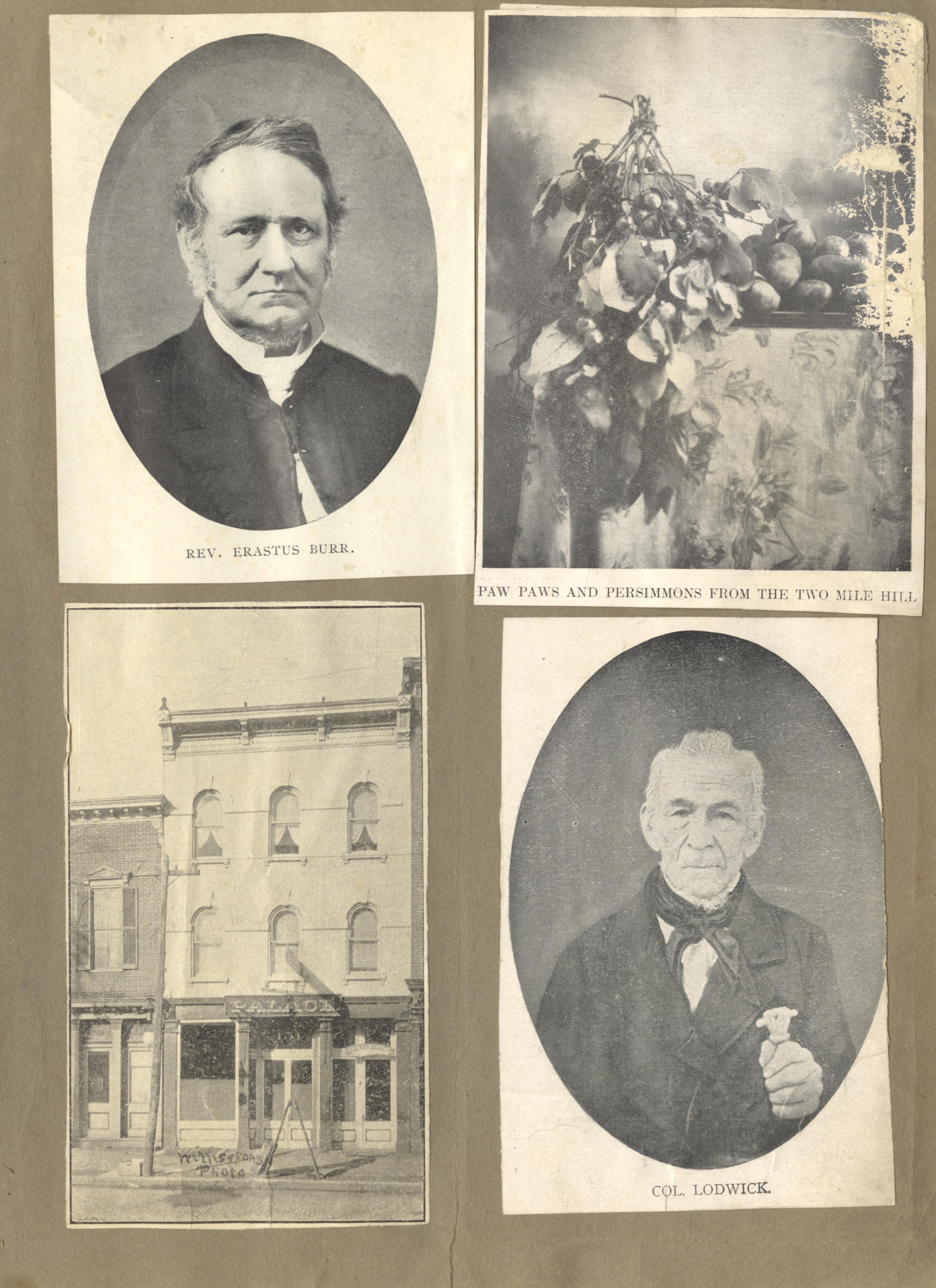 - Photo image of scanned scrapbook page. Pictured: Rev. Erastus Burr; Paw Paws Persimmons from the Two Mile Hill; Palace Restaurant on West Second (2nd) Street