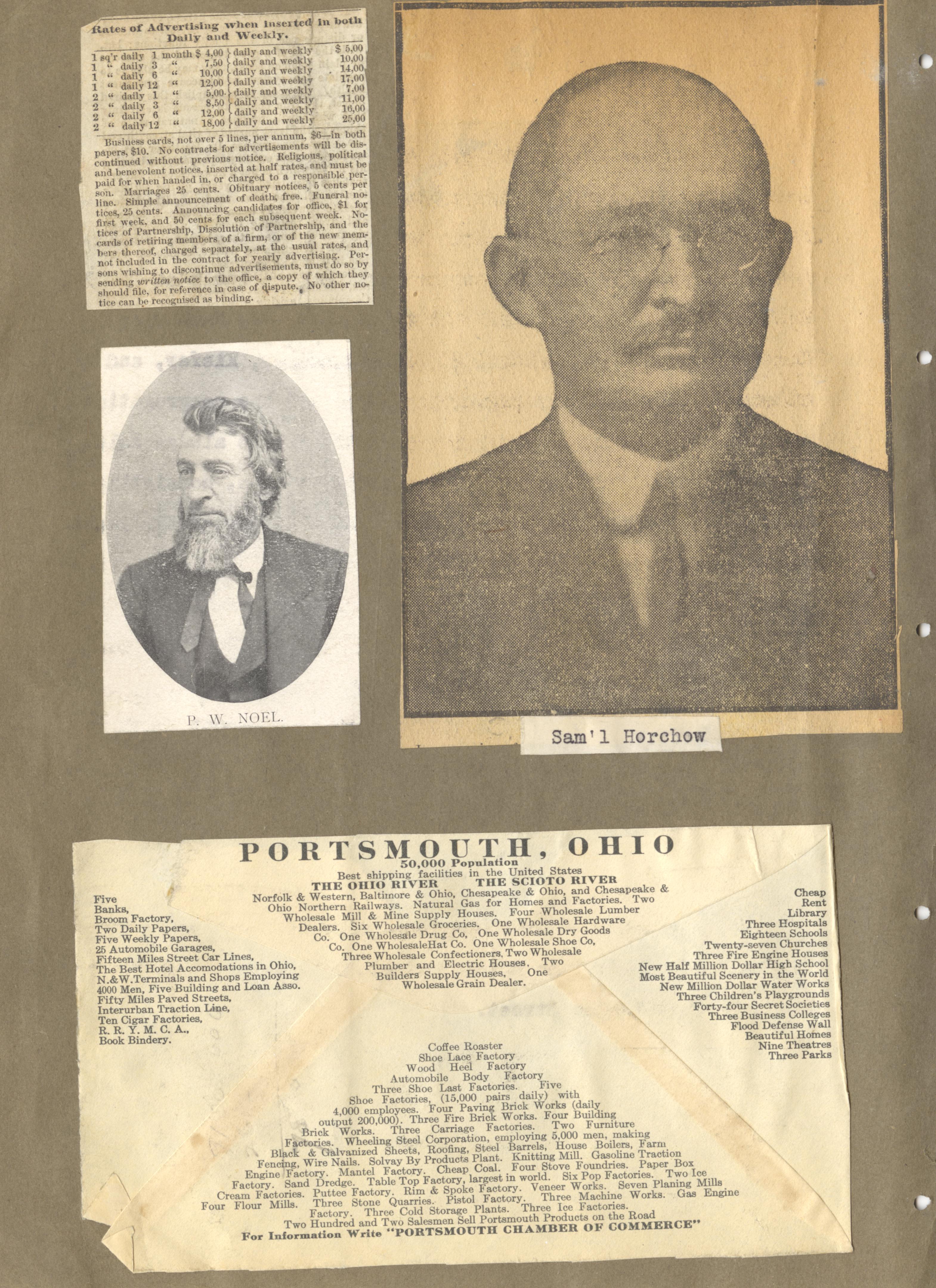 Henry A. Lorberg , “Sam'l Horchow; P. W. Noel; Portsmouth, Best Shipping Facilities and Other Facts About Portsmouth,” Scioto County Public Library Local History Digital Collection, accessed December 6, 2025, https://www.sciotolibrary.org/history/items/show/22420.