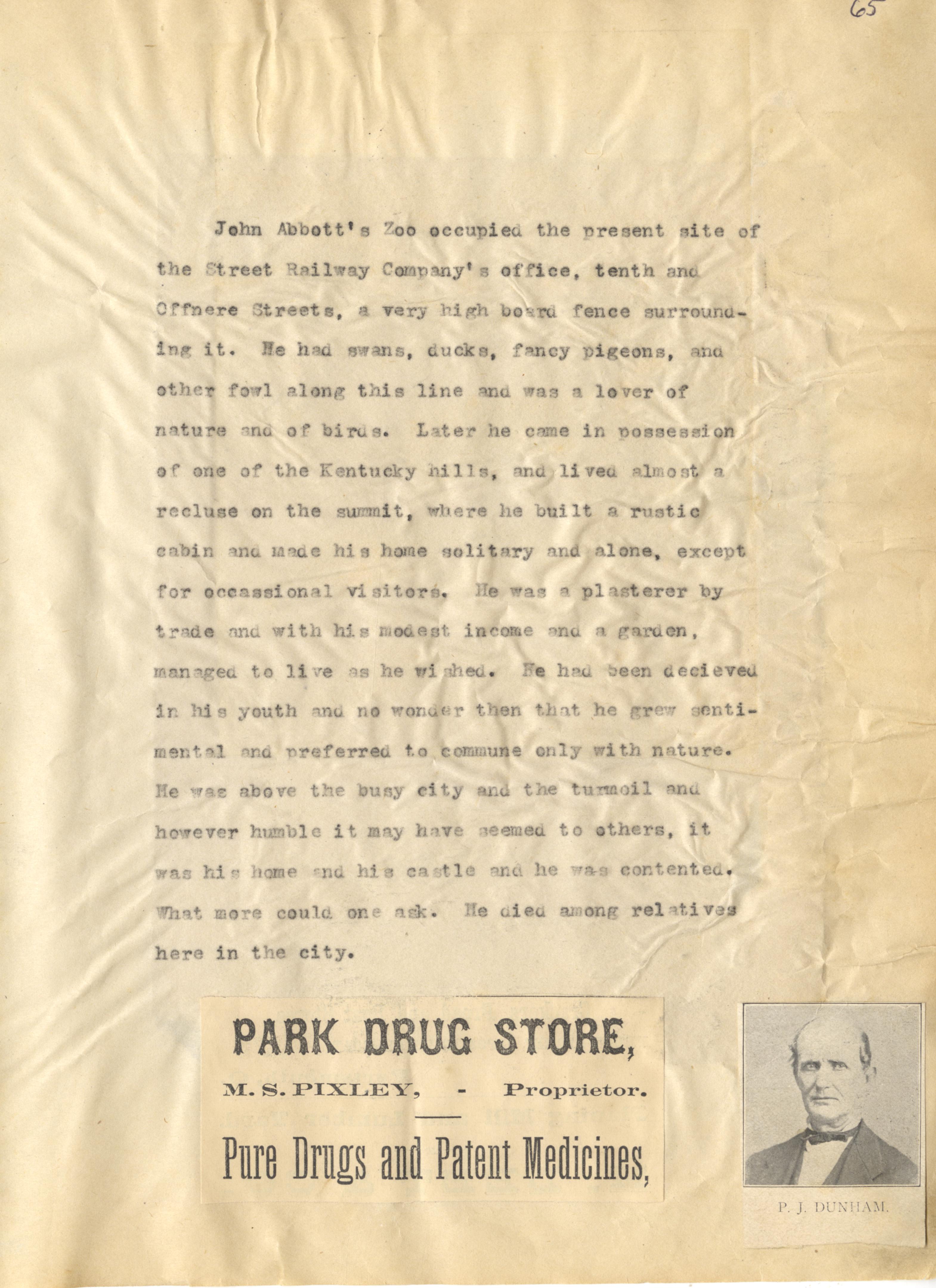 - Photo image of scanned scrapbook page. Pictured: typed page giving details about John Abbott's Zoo; Ad for Park Drug Store; P. J. Dunham