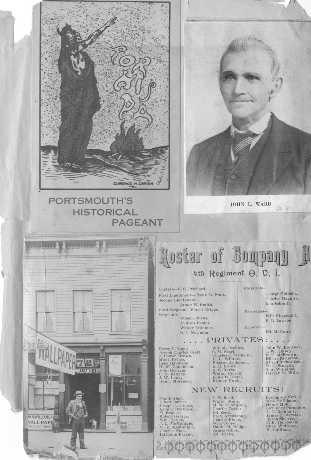 - Scanned unnumbered page from Henry A. Lorberg scrapbook containing black & white illustration used to promote Portsmouth's Historical Pageant in 1922; black & white images of John L. Ward and H. Williams Wallpaper on E. 2nd St.; and a Roster of Company H., 4th Regiment O.V.I.
