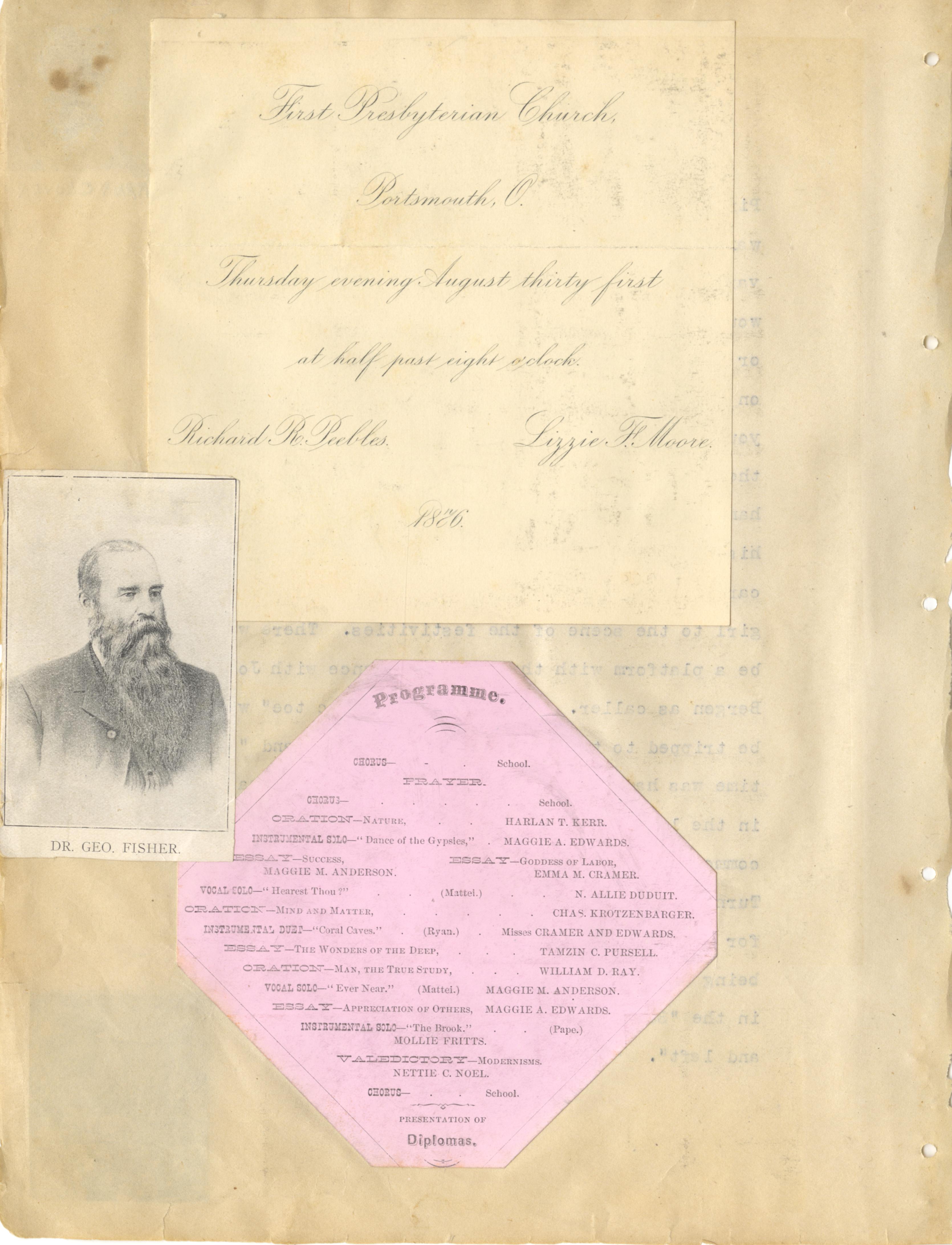 - Photo image of scanned scrapbook page. Pictured: Dr. George Fisher; Wedding Announcement of Richard R. Peebles and Lizzie F. Moore (1876); Programme For Prayer