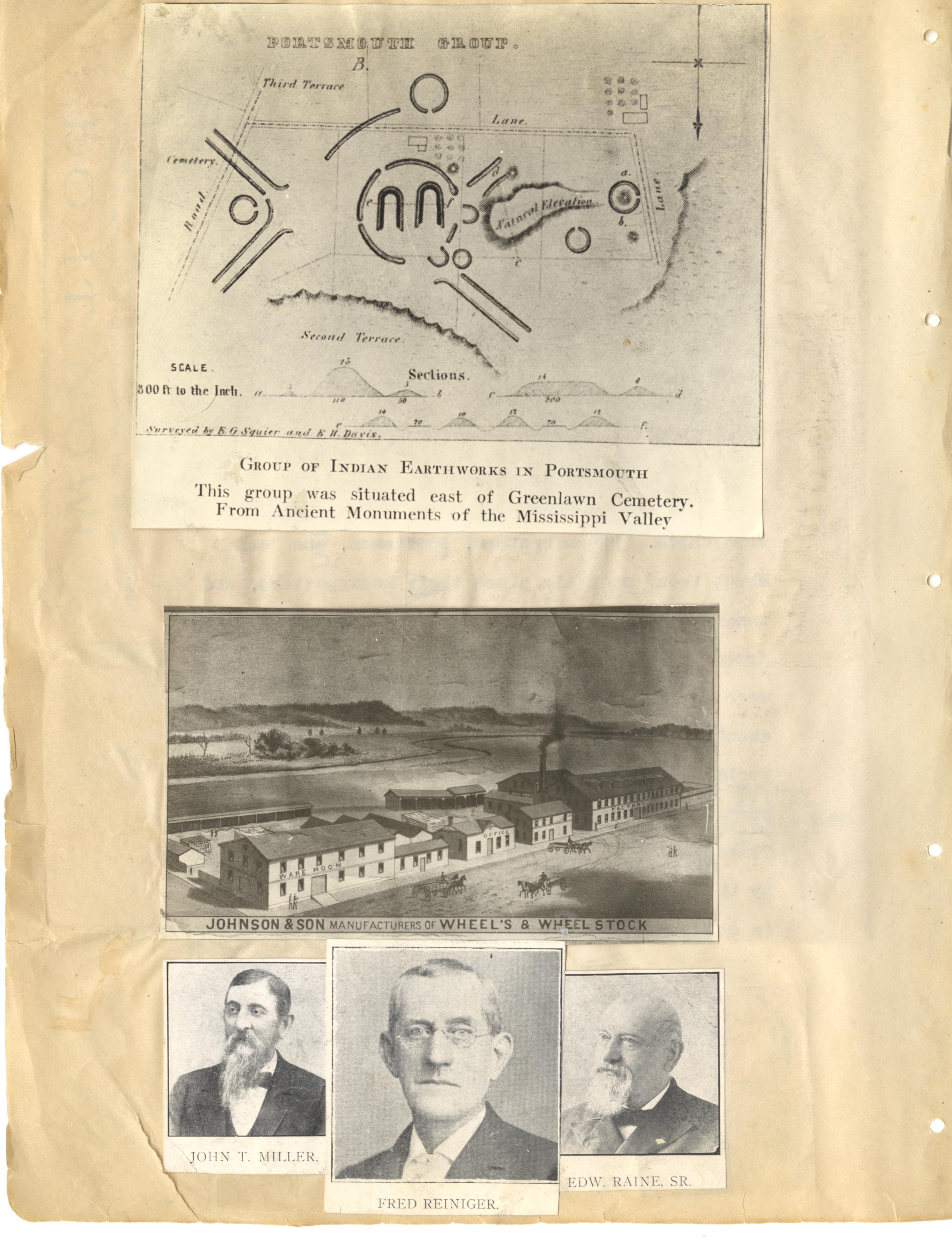 - Photo image of scanned scrapbook page. Pictured: Group of Indian Earthworks in Portsmouth; Johnson & Son Manufacturers of Wheelstock; John T. Miller; Fred Reiniger; Edward Raine Sr.