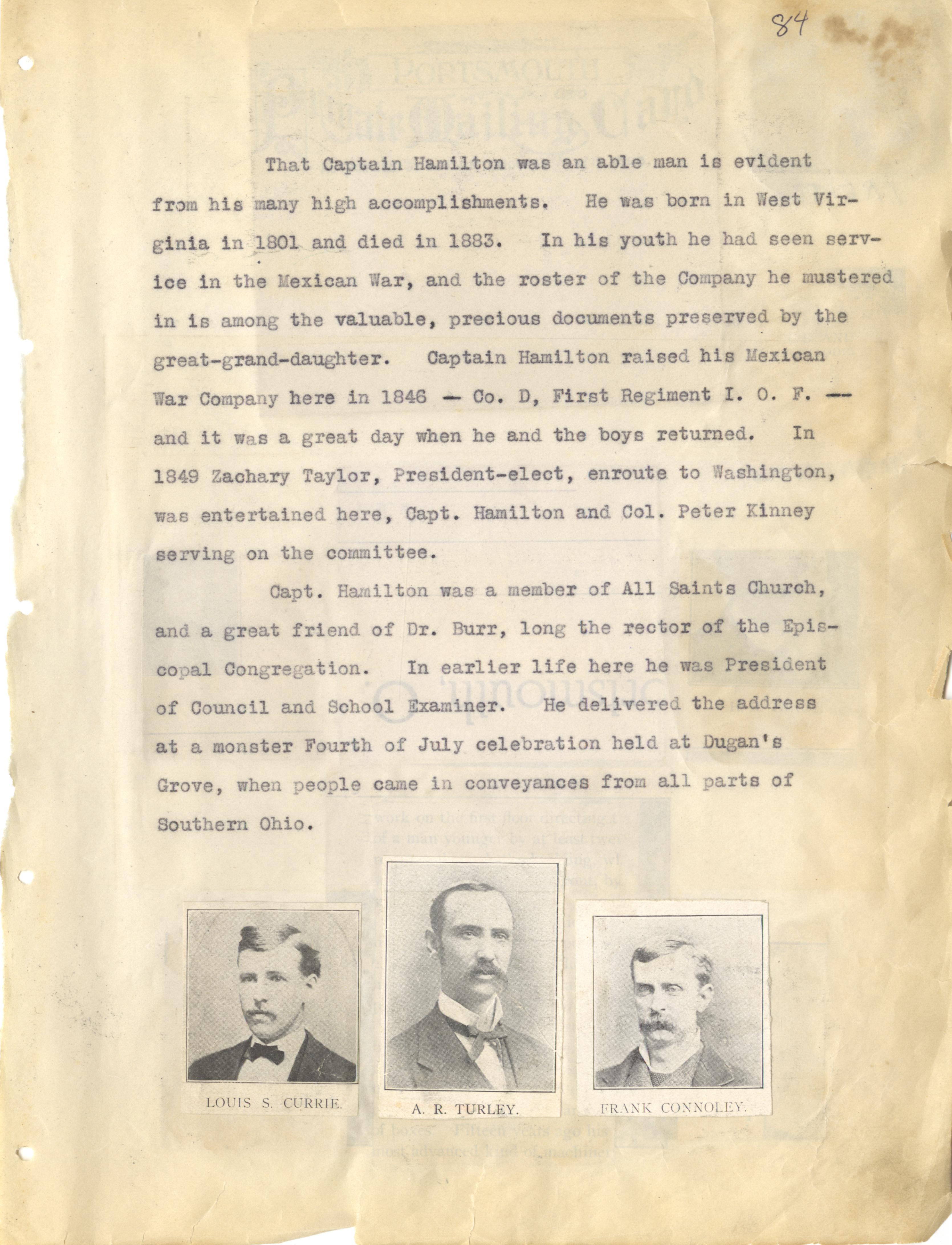 - Photo image of scanned scrapbook page. Pictured: Louis S. Currie; A. R. Turley; Frank Connoley; typed page giving information about Captain Hamilton