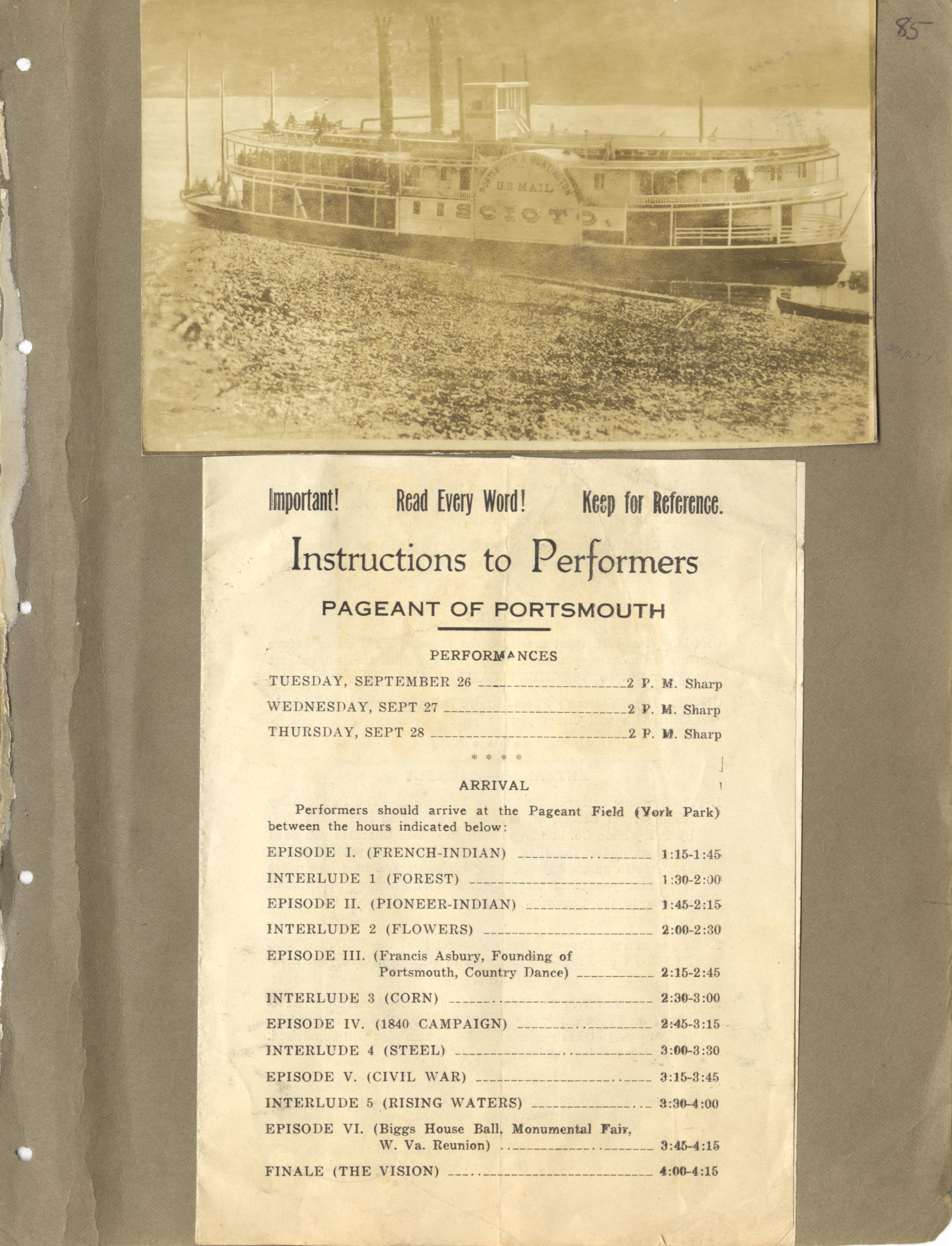 - Photo image of scanned scrapbook page. Pictured: Steamboat the Scioto; Pageant of Portsmouth Instructions to Performers
