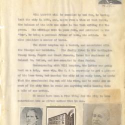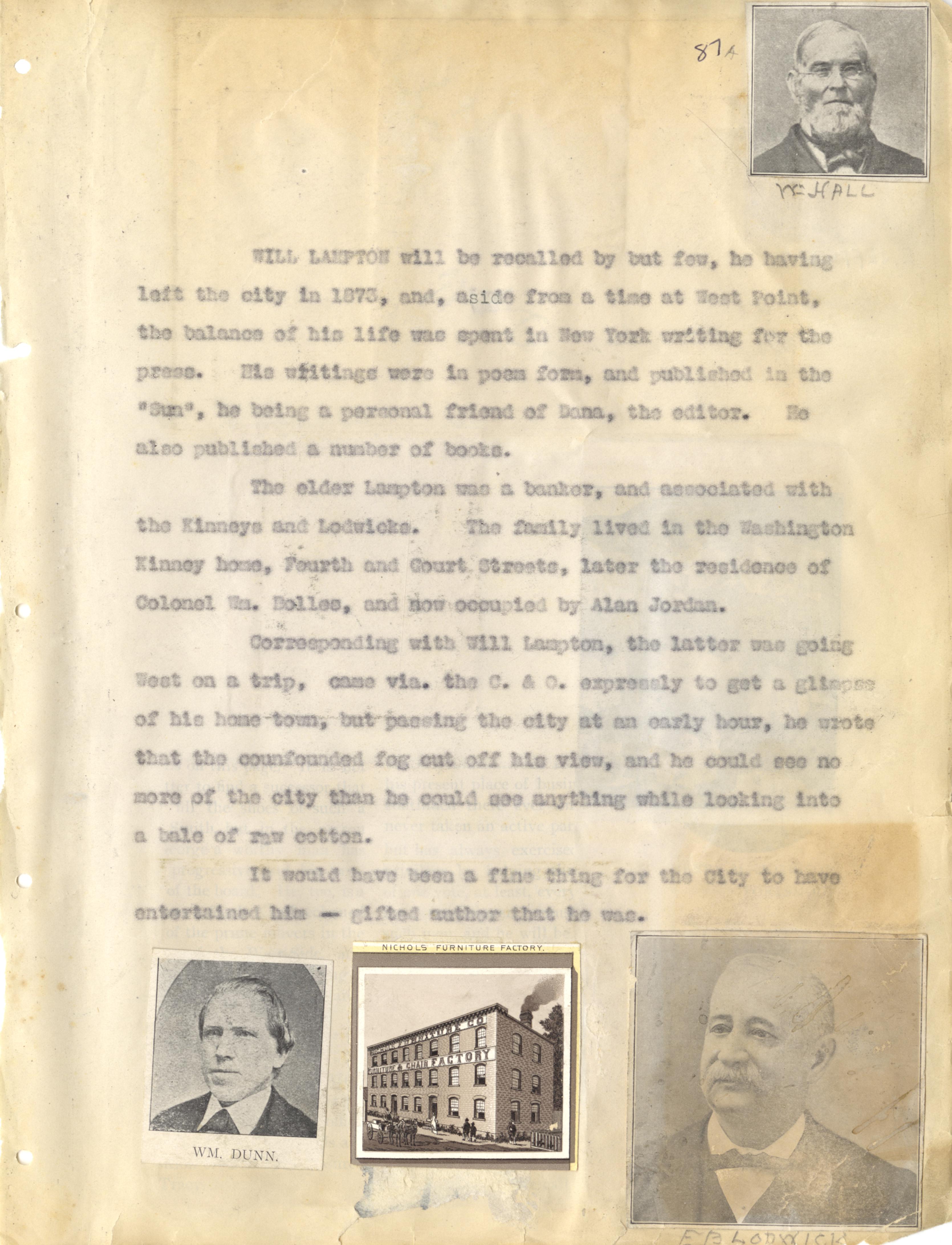 - Photo image of scanned scrapbook page. Pictured: Typed page giving information about Will Lampton; Wm Hall; Wm. Dunn; Nicholas Furniture Factory; E. P. Lodwick