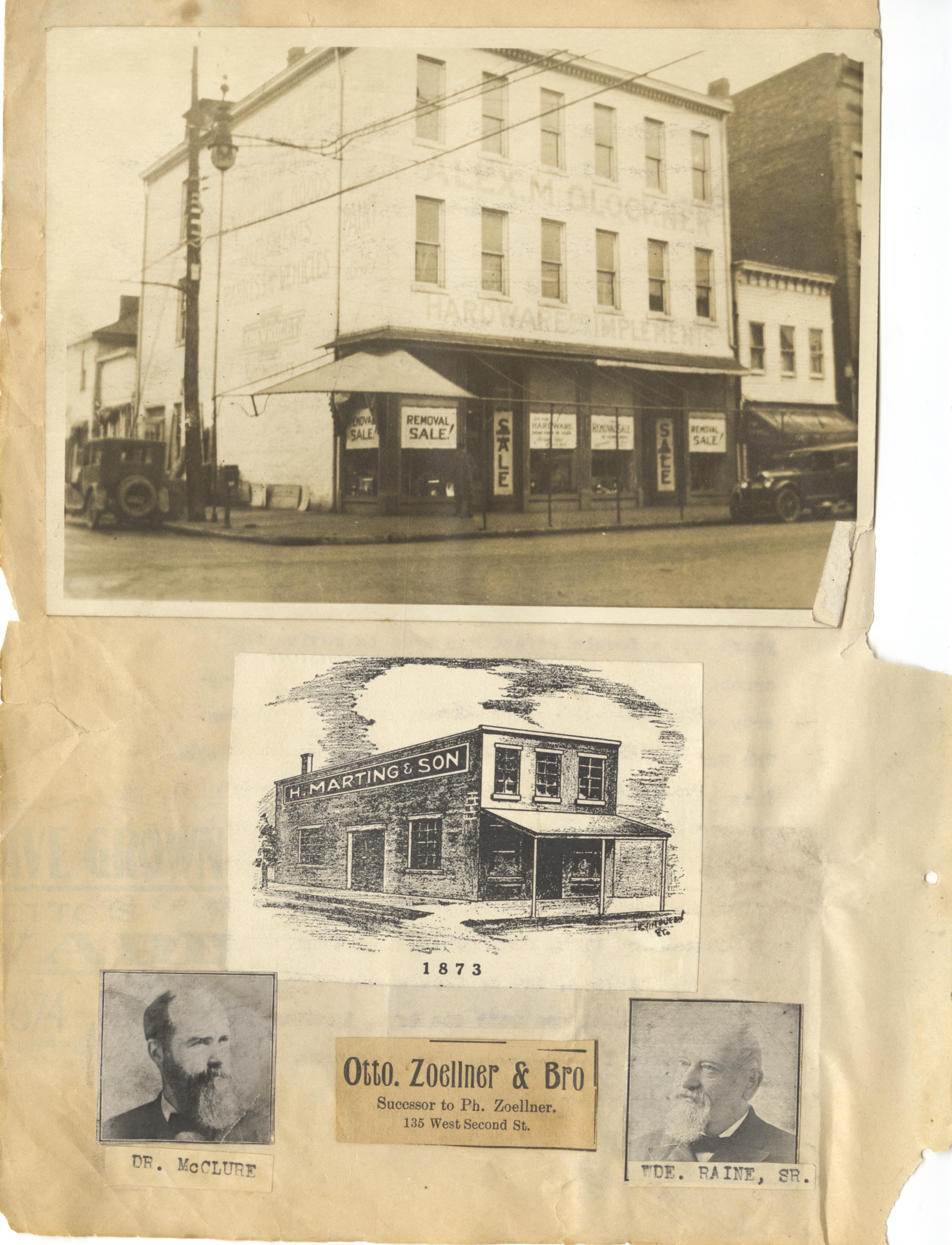 - Photo image of scanned scrapbook page. Pictured: Glockner Hardware Store; H. Marting & Son (1873); Dr. McClure; Wd. Raine Sr.