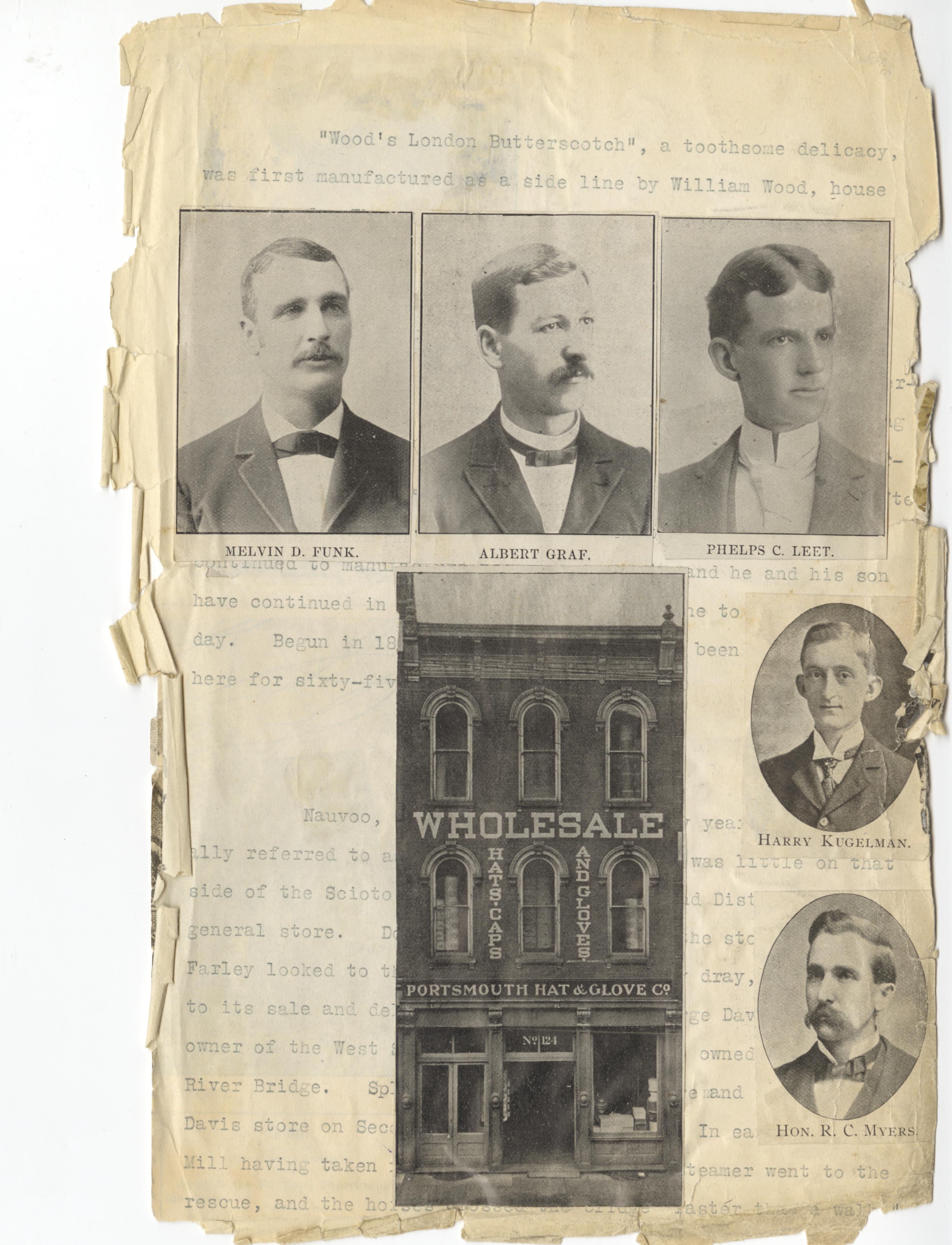 - Photo image of scanned scrapbook page. Pictured: Melvin D. Funk; Albert Graf; Phelps C. Leet; Harry Kegelman; Hon. R. C. Myers; Portsmouth Hat & Glove Company