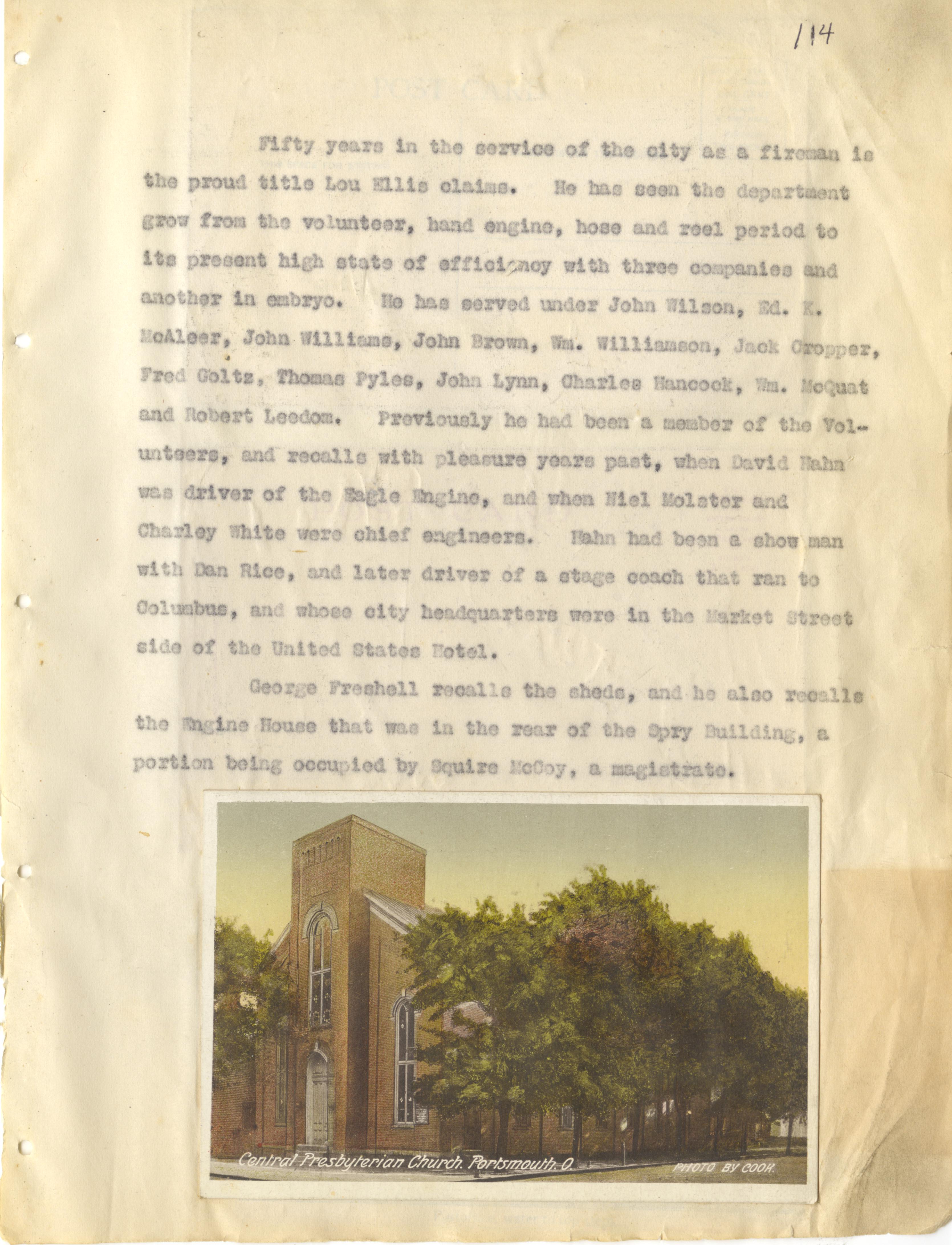 - Photo image of scanned scrapbook page. Pictured: Portsmouth Firemen; Central Presbyterian Church