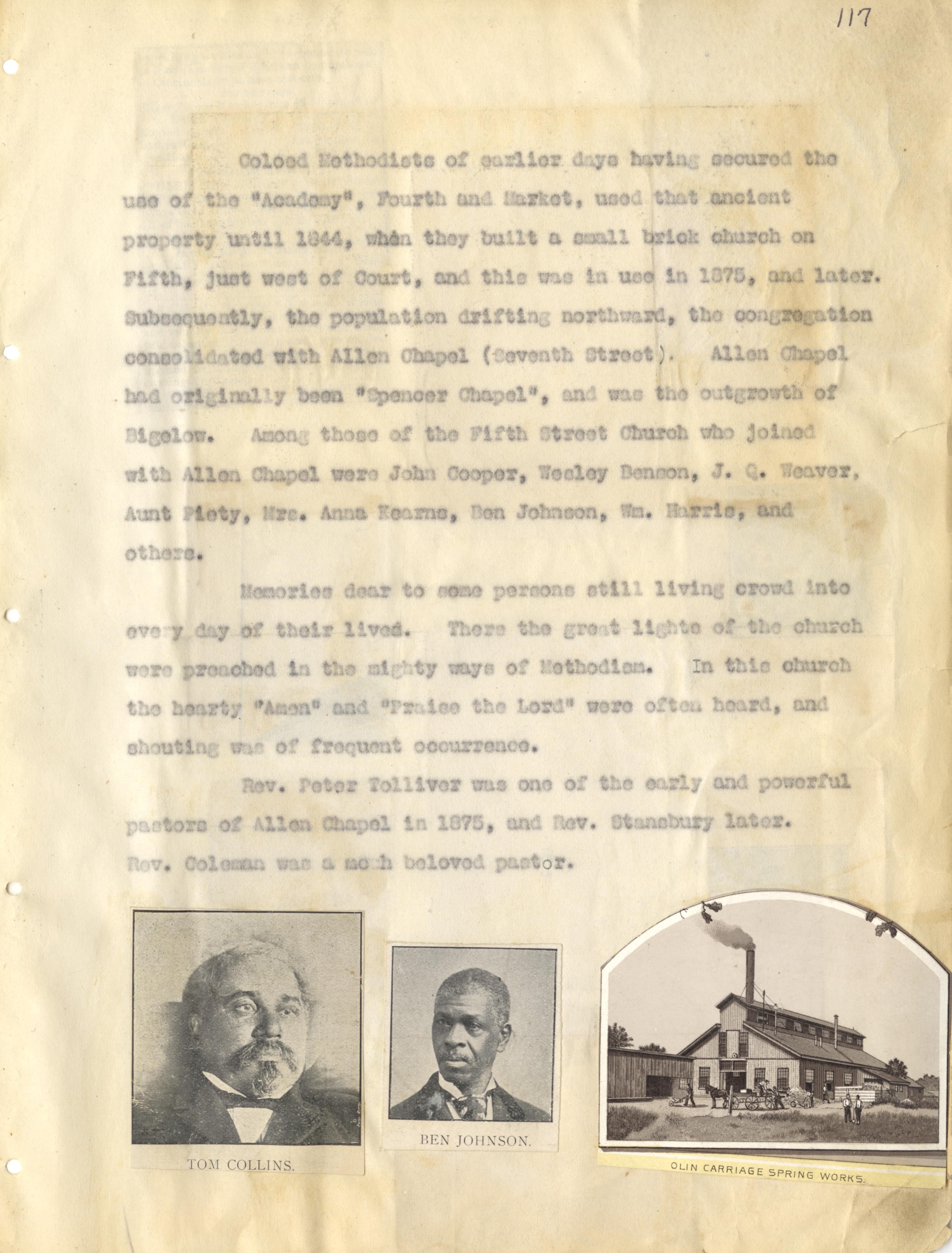 - Photo image of scanned scrapbook page. Pictured: Typed page giving information about the Colored Methodist Church; Tom Collins; Ben Johnson; Olin Carriage Works