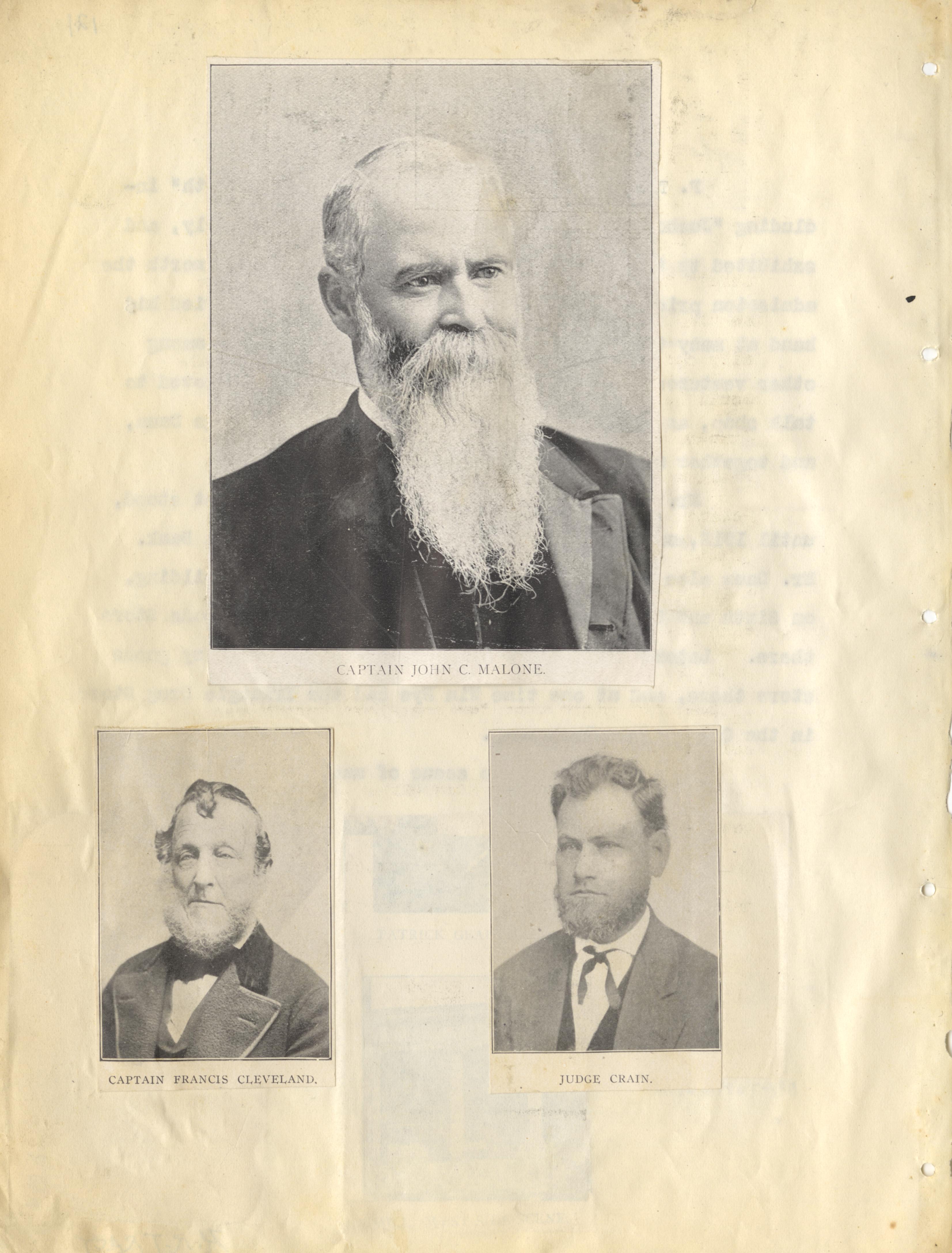 - Photo image of scanned scrapbook page. Pictured are three images cut from a Lorberg publication: Captain John C. Malone; Captain Francis Cleveland; Judge Crain