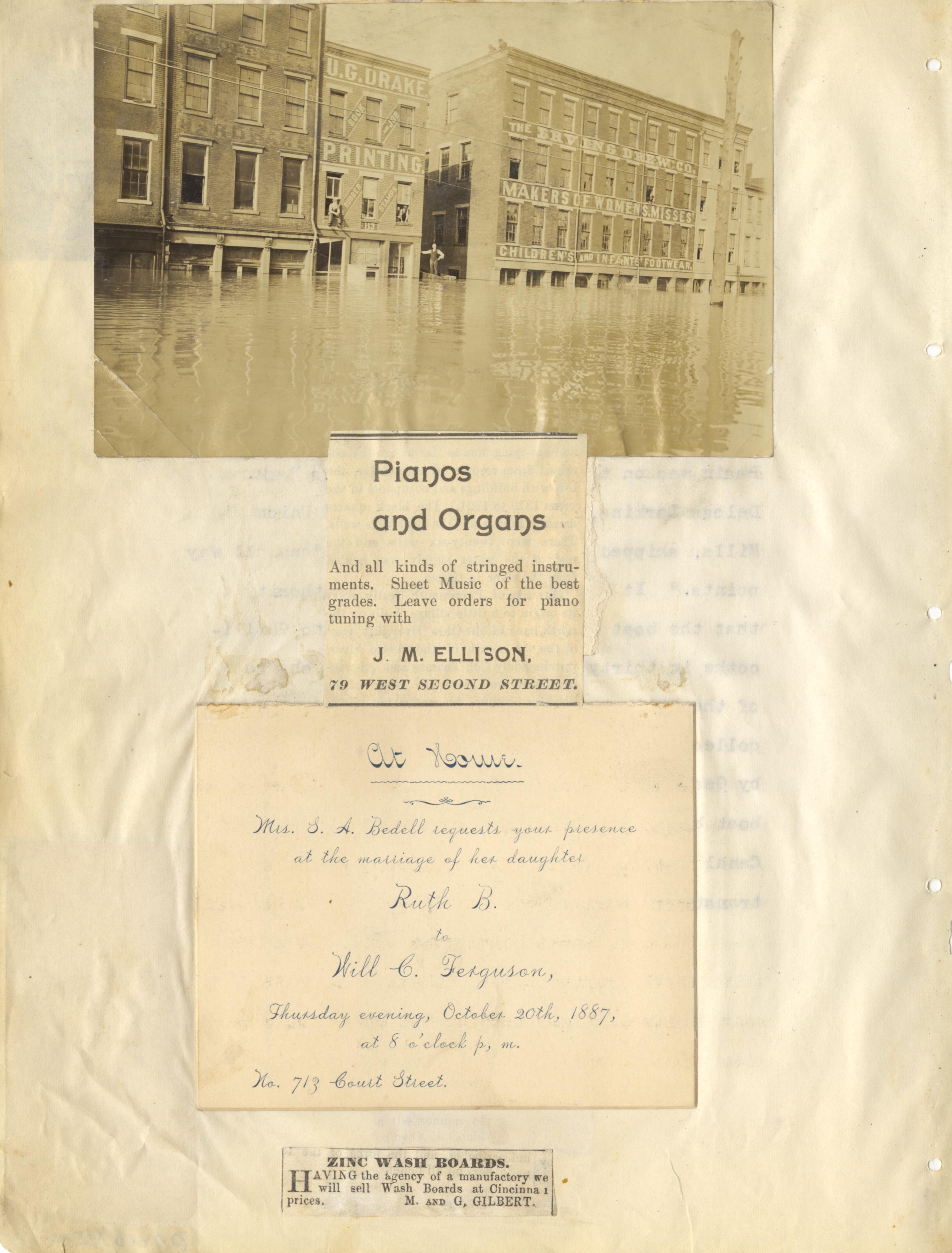 - Photo image of scanned scrapbook page. Pictured: black and white photo of a Flood Scene Photo; a newspaper ad for J. M. Ellison, Pianos and Organs at 79 West Second (2nd) Street; Wedding Invitation for Ruth B. Bedell and Will C. Ferguson on October 20, 1887 at 713 Court Street