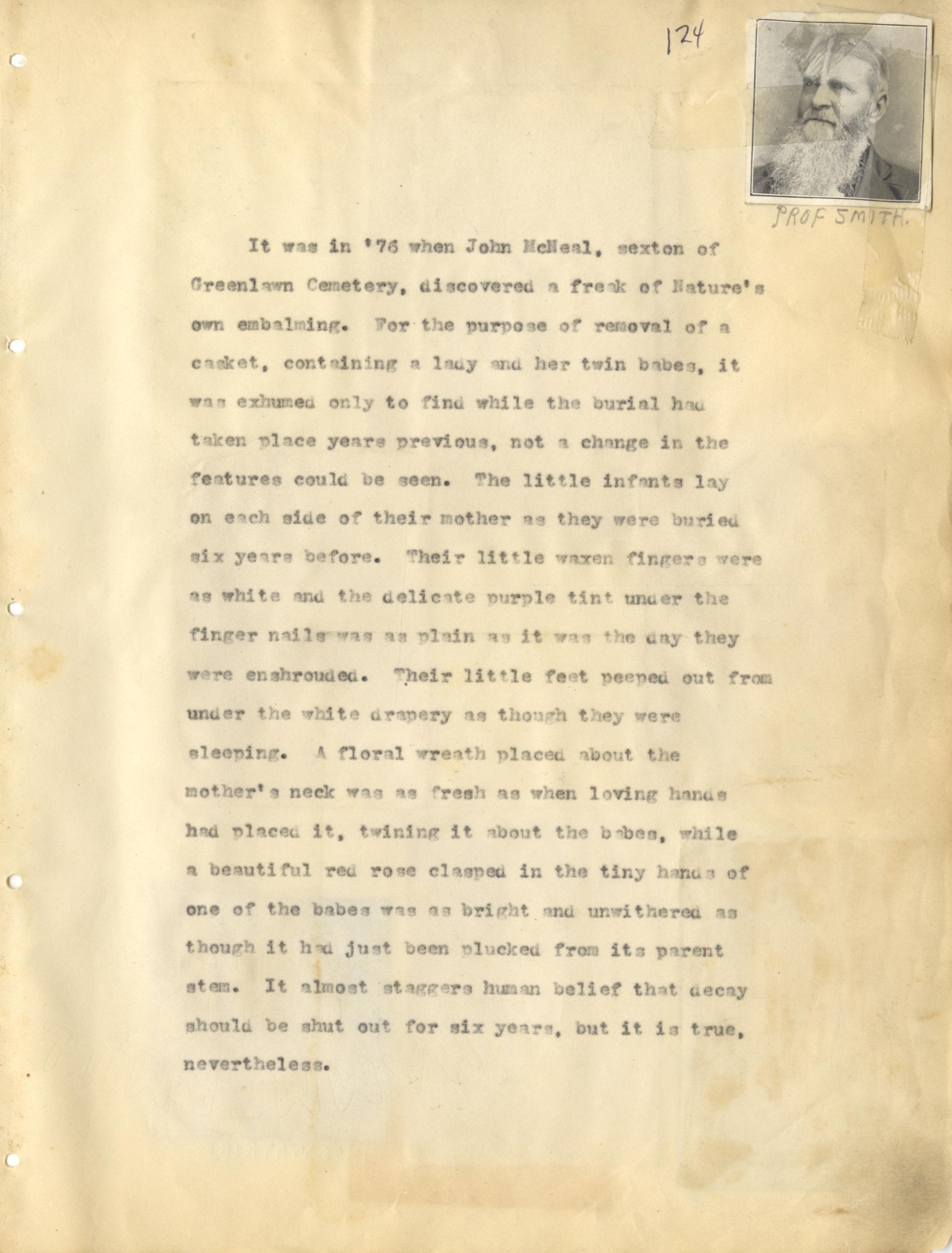 - Photo image of scanned scrapbook page. Pictured: Prof. Smith and a typed page giving details about Nature's Own Embalming. in 1876, a casket was removed from Greenlawn Cemetery. Inside was a mother and her two twin babies, perfectly preserved.