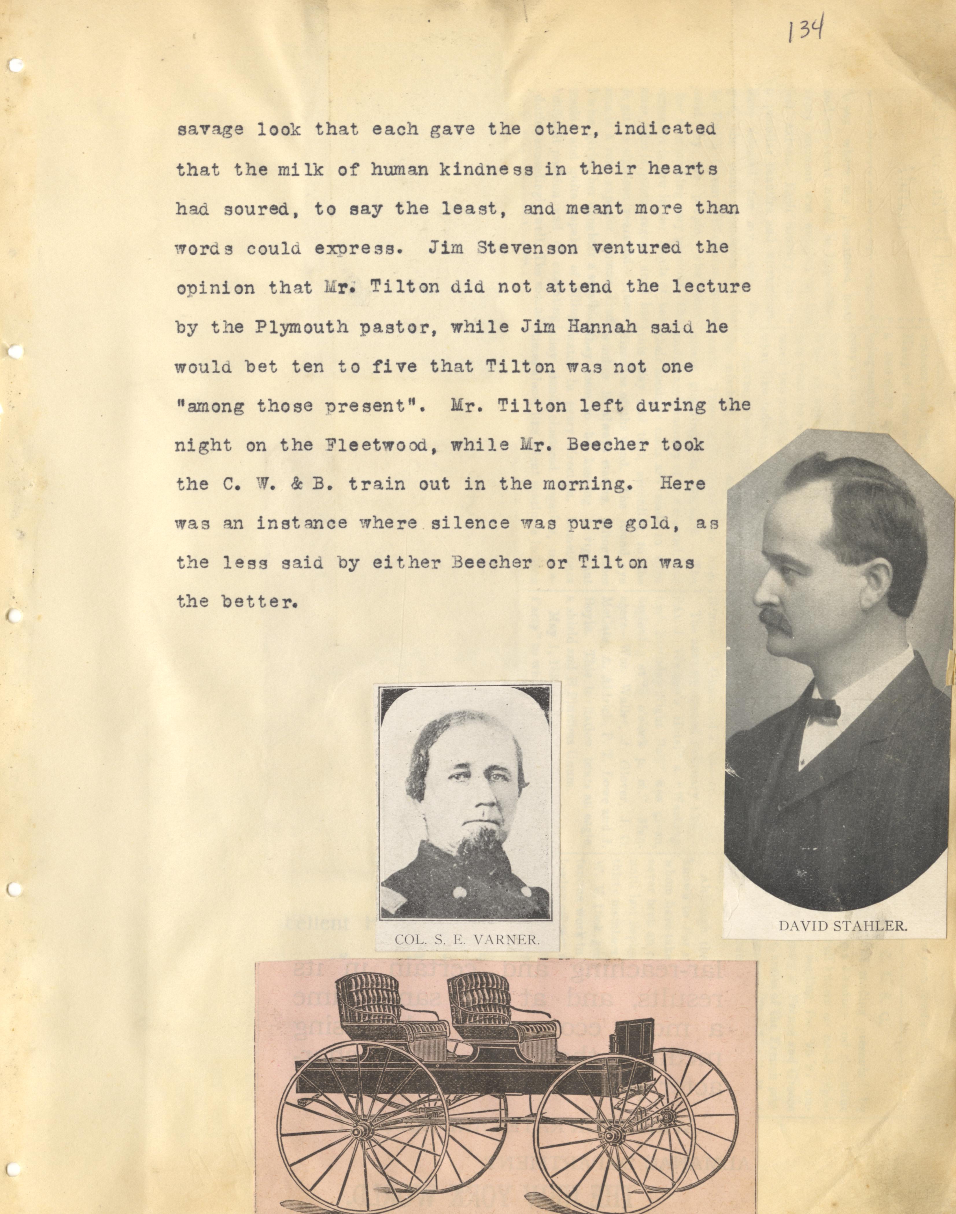 - Photo image of scanned scrapbook page. Pictured: David Stahler; Col. S. E. Varner; Two Person Buggy; The Beecher- Tilton Slander Suit Continued