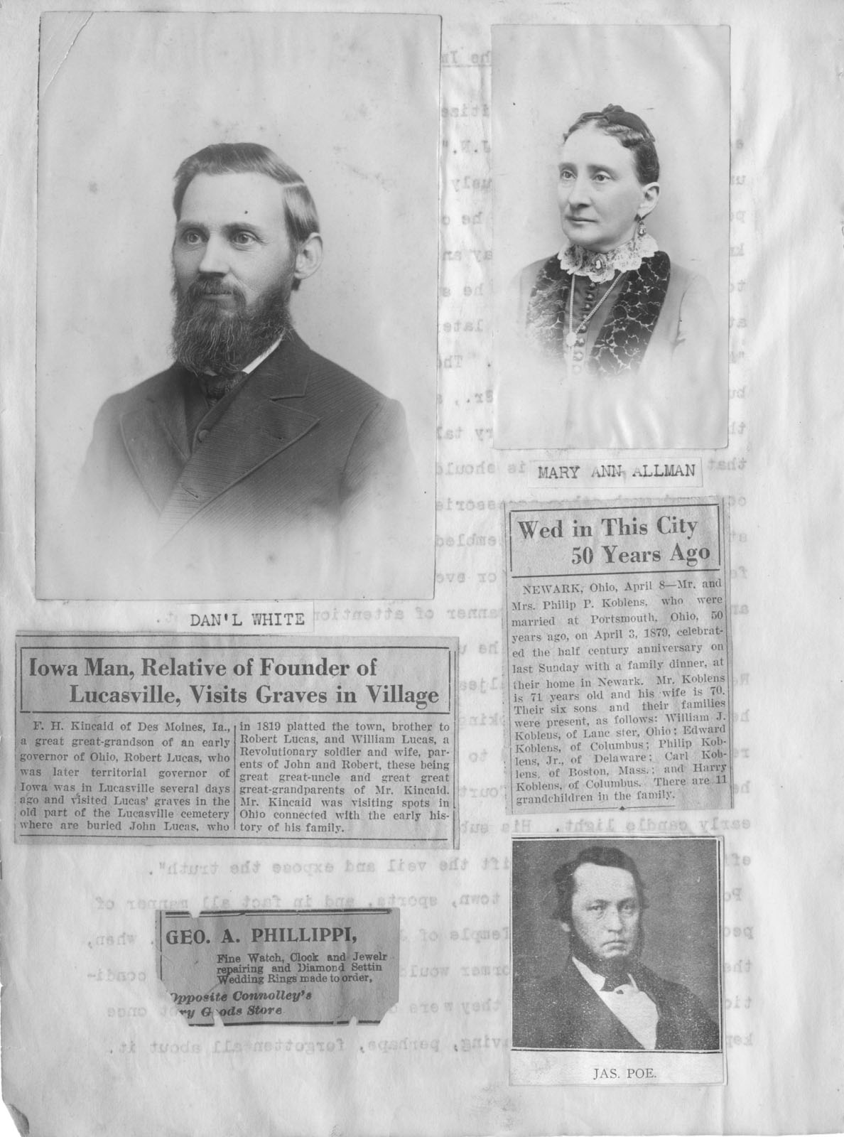 - Scanned unnumbered page from Henry A. Lorberg scrapbook containing black & white images of Dan'l White; Mary Ann Allman; and Jas. Poe. Clipping of a newspaper article about F. H. Kincaid of Iowa, descendant of early Ohio governor, Robert Lucas visiting Lucasville and Lucas' grave. Clipping of an ad for Geo. A. Phillippi, jewelr. Clipping of a 50th, wedding anniversary announcement for Mr. and Mrs. Philip P. Koblens.