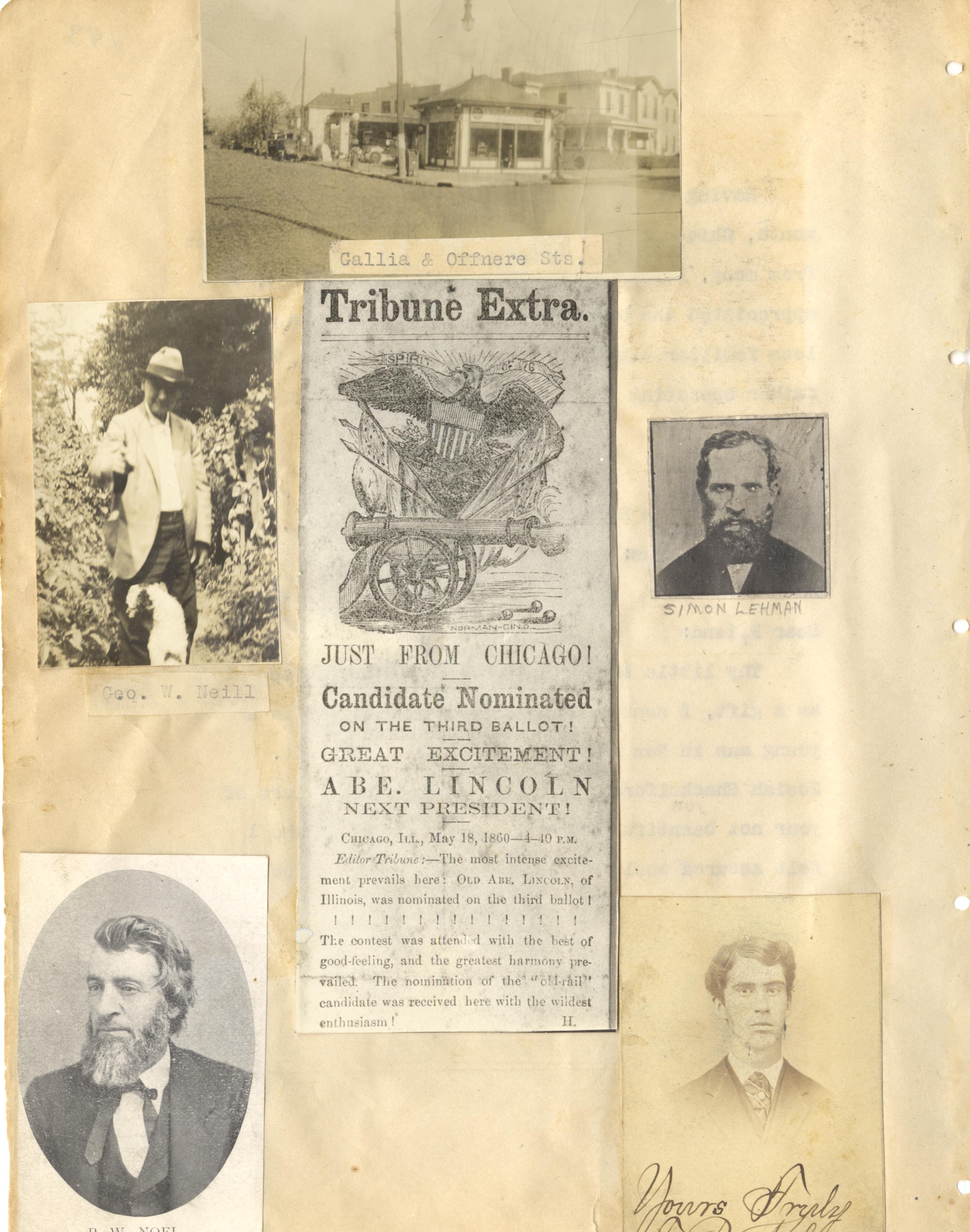 - Photo image of scanned scrapbook page. Pictured: Gallia & Offnere Sts.; George W. Neill; Simon Lehman; W. Noel; Tribune Extra from May 18, 1860, ad for Abe Lincoln as president
