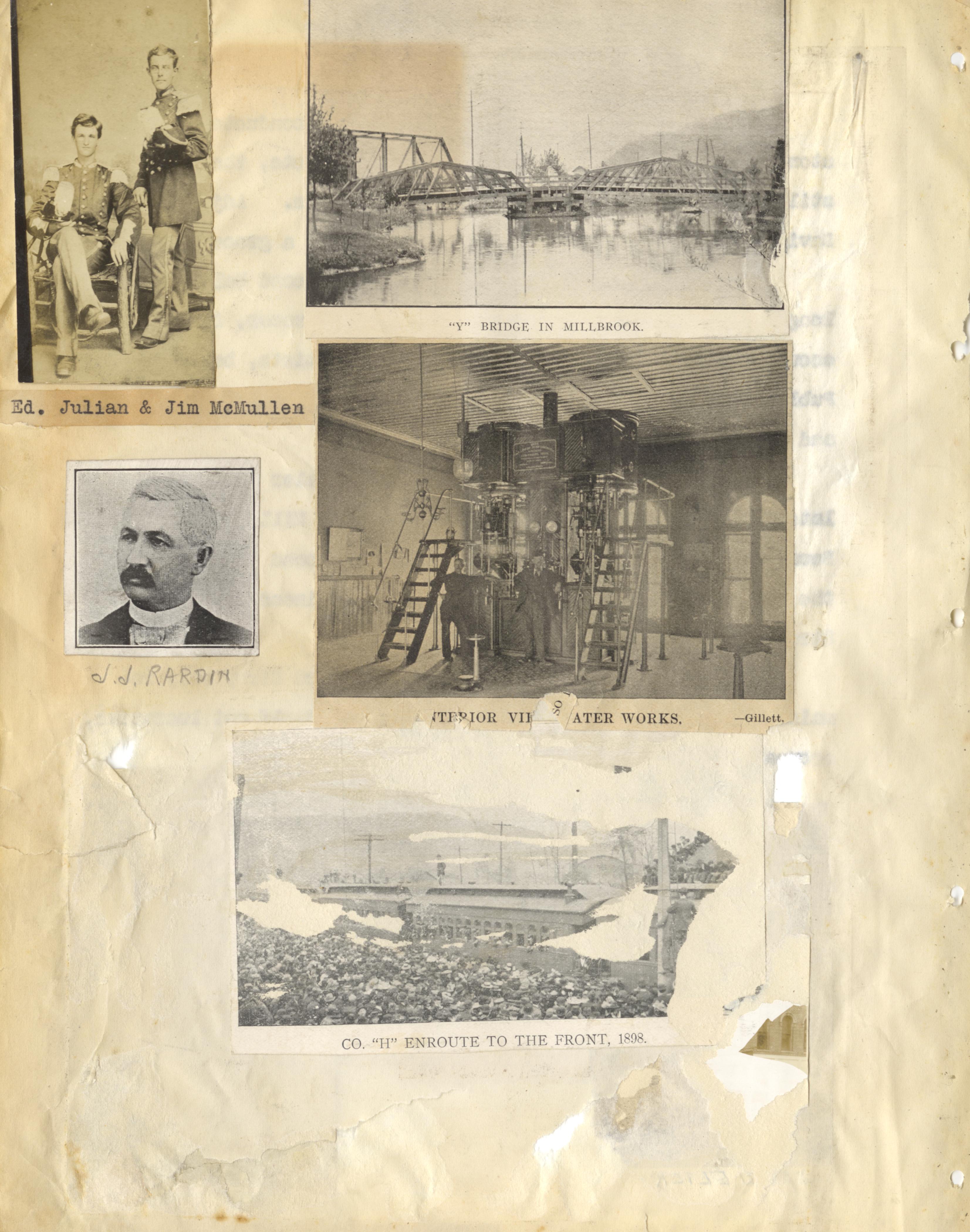 - Photo image of scanned scrapbook page. Pictured: Ed, Julian & Jim McCullen; "Y" Bridge in Millbrook; Interior of the Waterworks; Co. H. Enroute to the Front, 1808