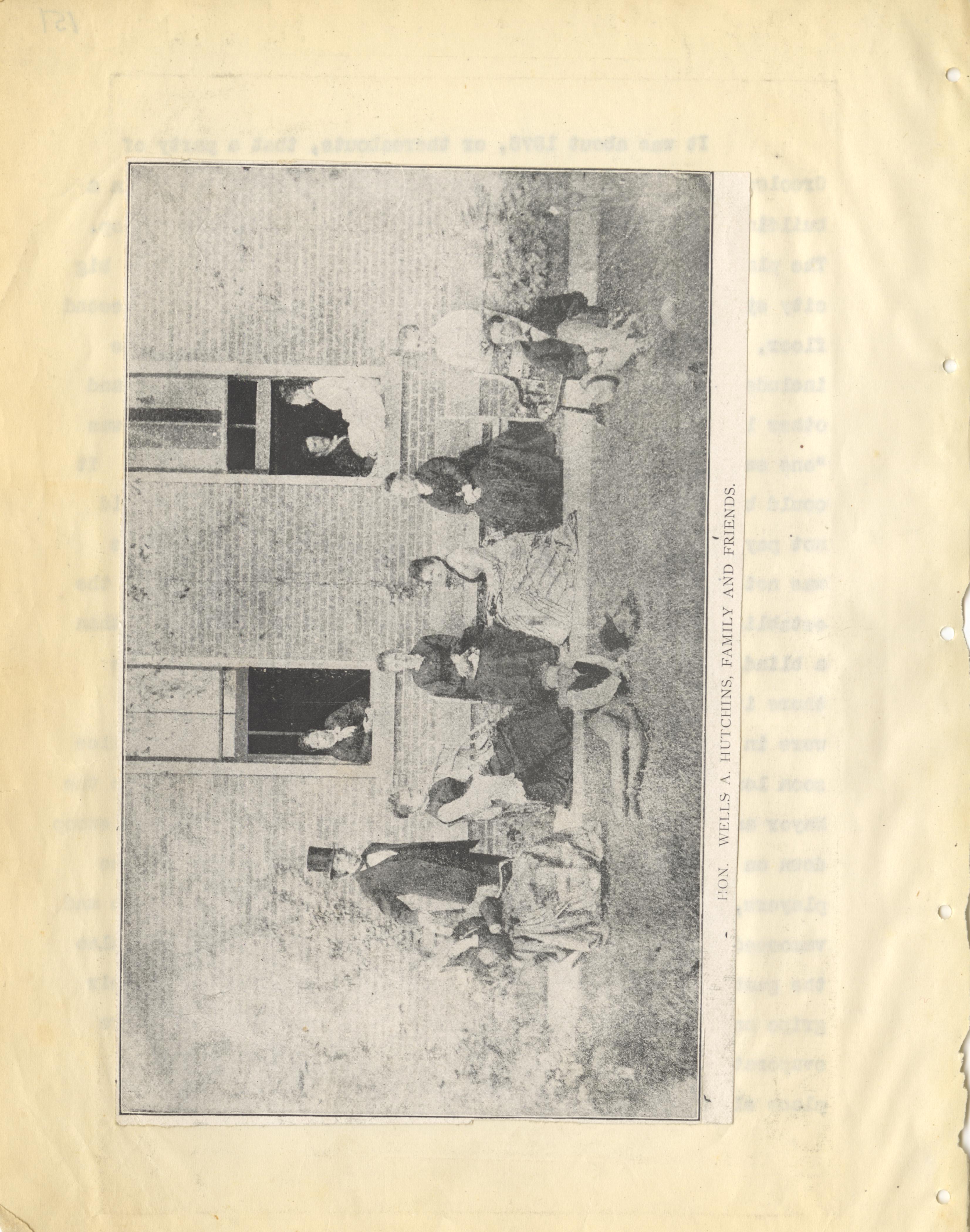 - Photo image of scanned scrapbook page. Pictured is a black and white photo of Hon. Wells A. Hutchins, family and friends