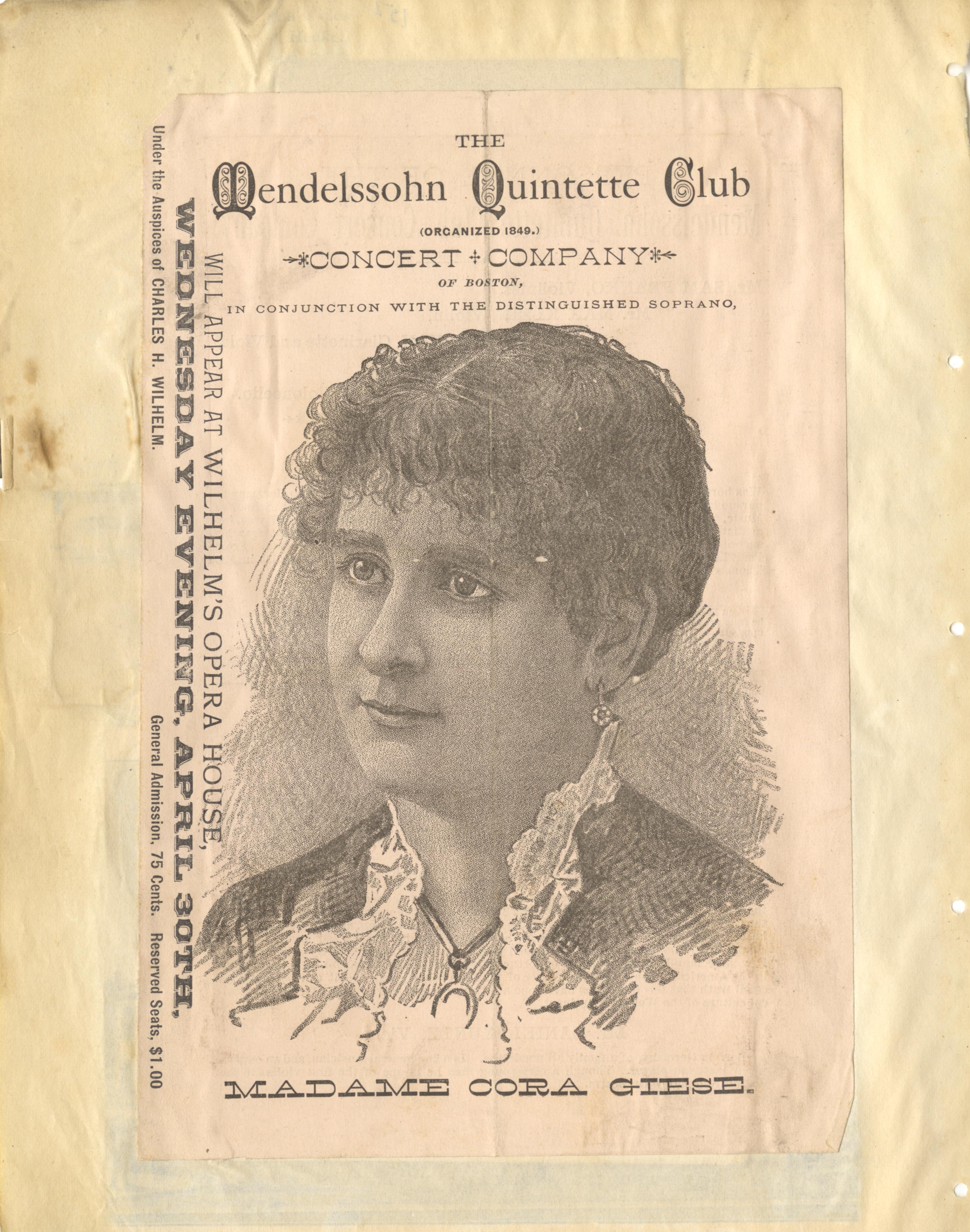 - Photo image of scanned scrapbook page. Pictured is a flyer for the Mendelssohn Quintette Club, Concert Company of Boston, organized in 1849. They were putting on a show at Wilhelm's Opera House, featuring Madame Cora Giese
