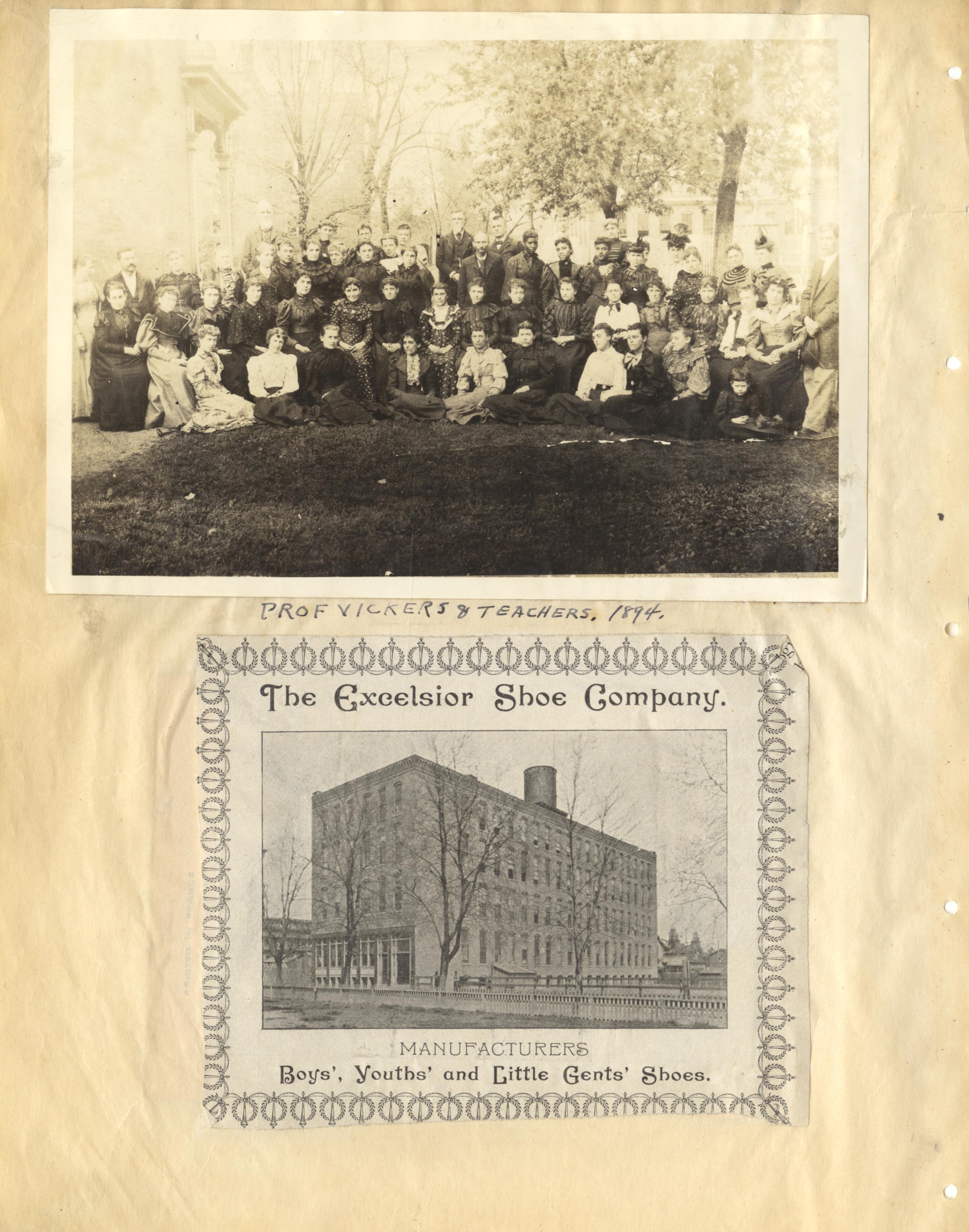 - Photo image of scanned scrapbook page. Pictured is a black and white photograph of Professor Vickers and Teachers (1894); The Excelsior Shoe Company