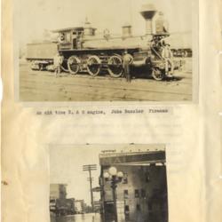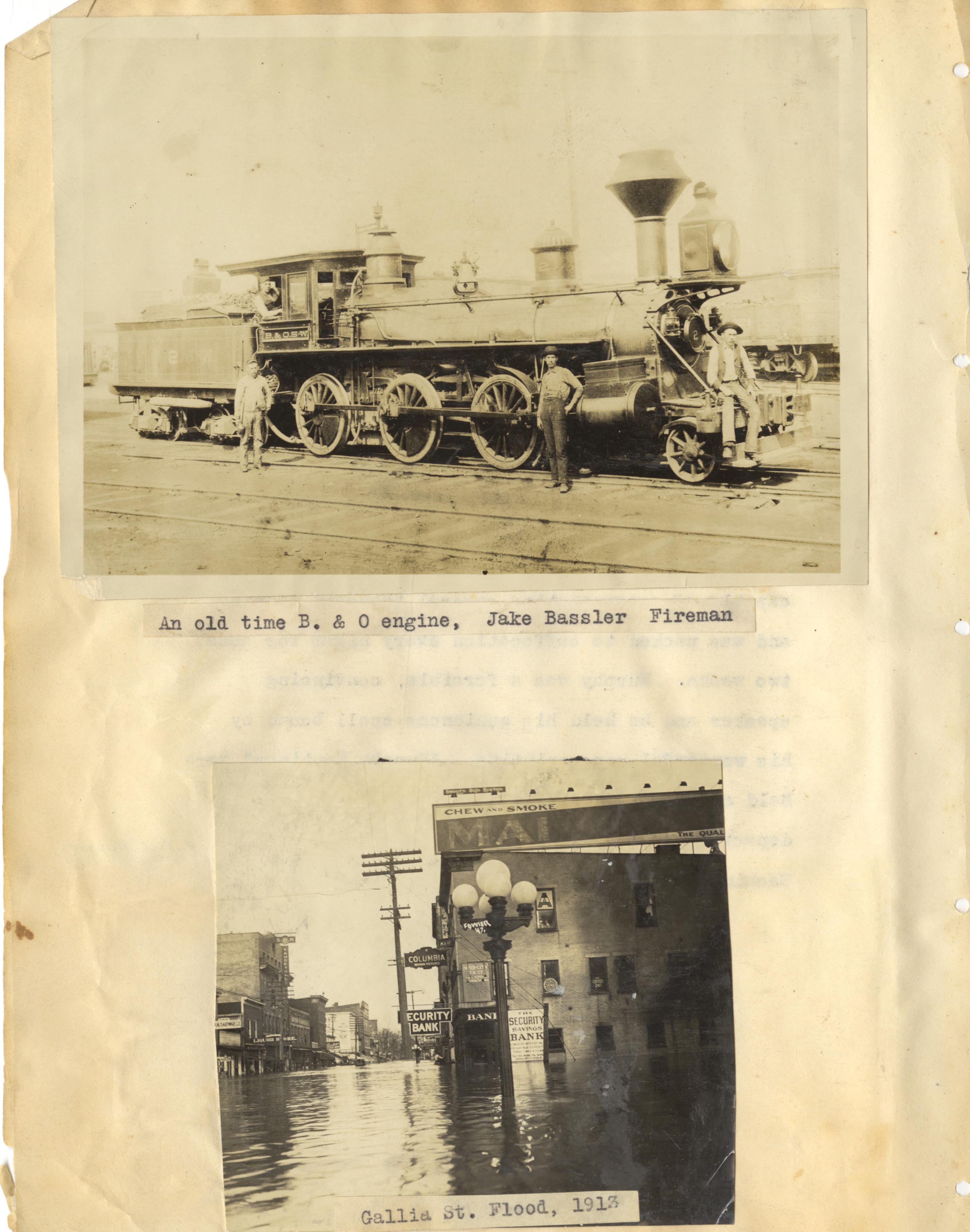 - Photo image of scanned scrapbook page. Pictured is An Old Time B & O Engine, Jake Bassler Fireman; Gallia Street Flood, 1913