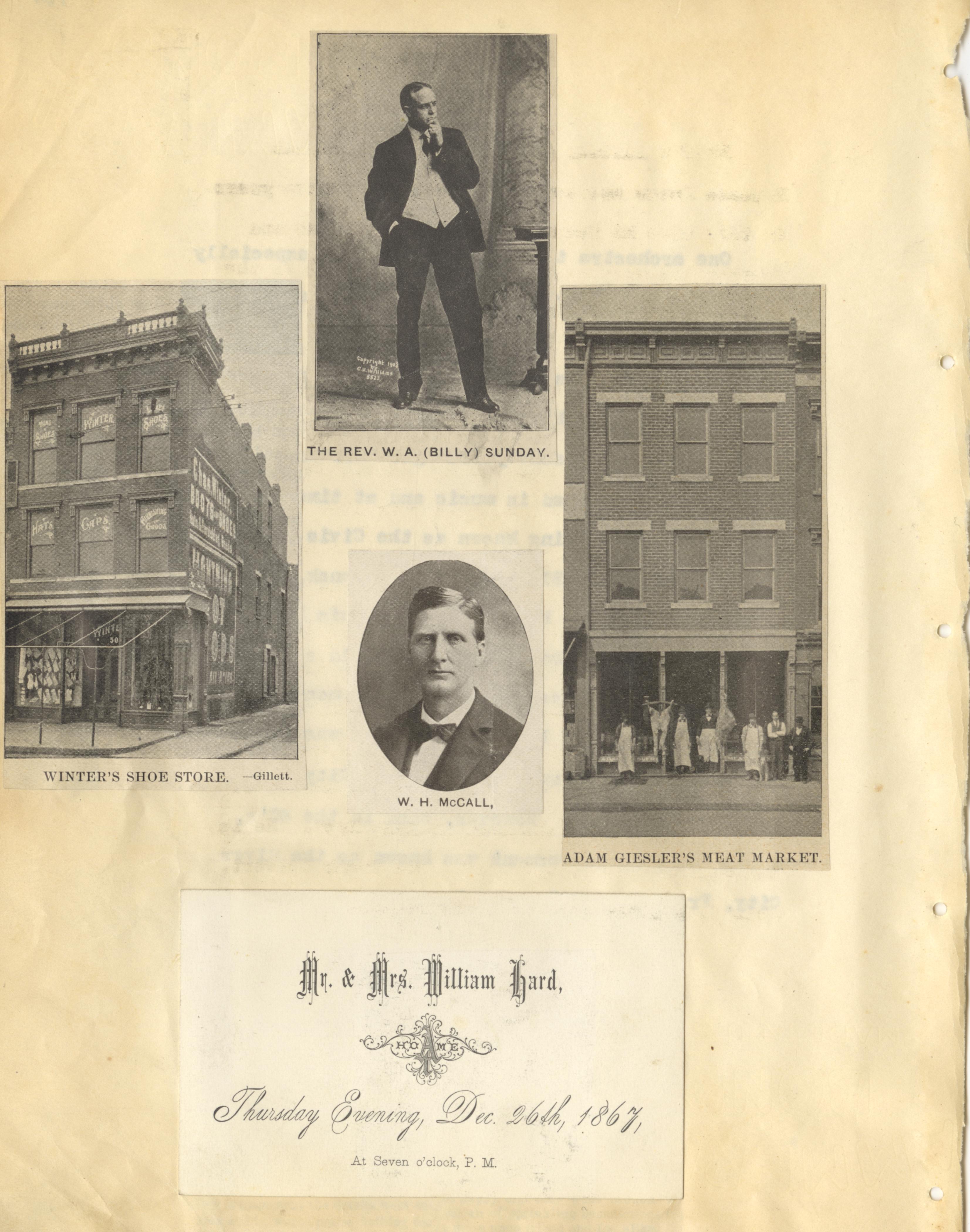 Winter's Shoe Store; Adam Giesler's Meat Market at 221 Market Street; The Rev. W. A. (Billy) Sunday; W. H. McCall; Event Card at the Home of Mr. and Mrs. William Hard on December 26, 1867