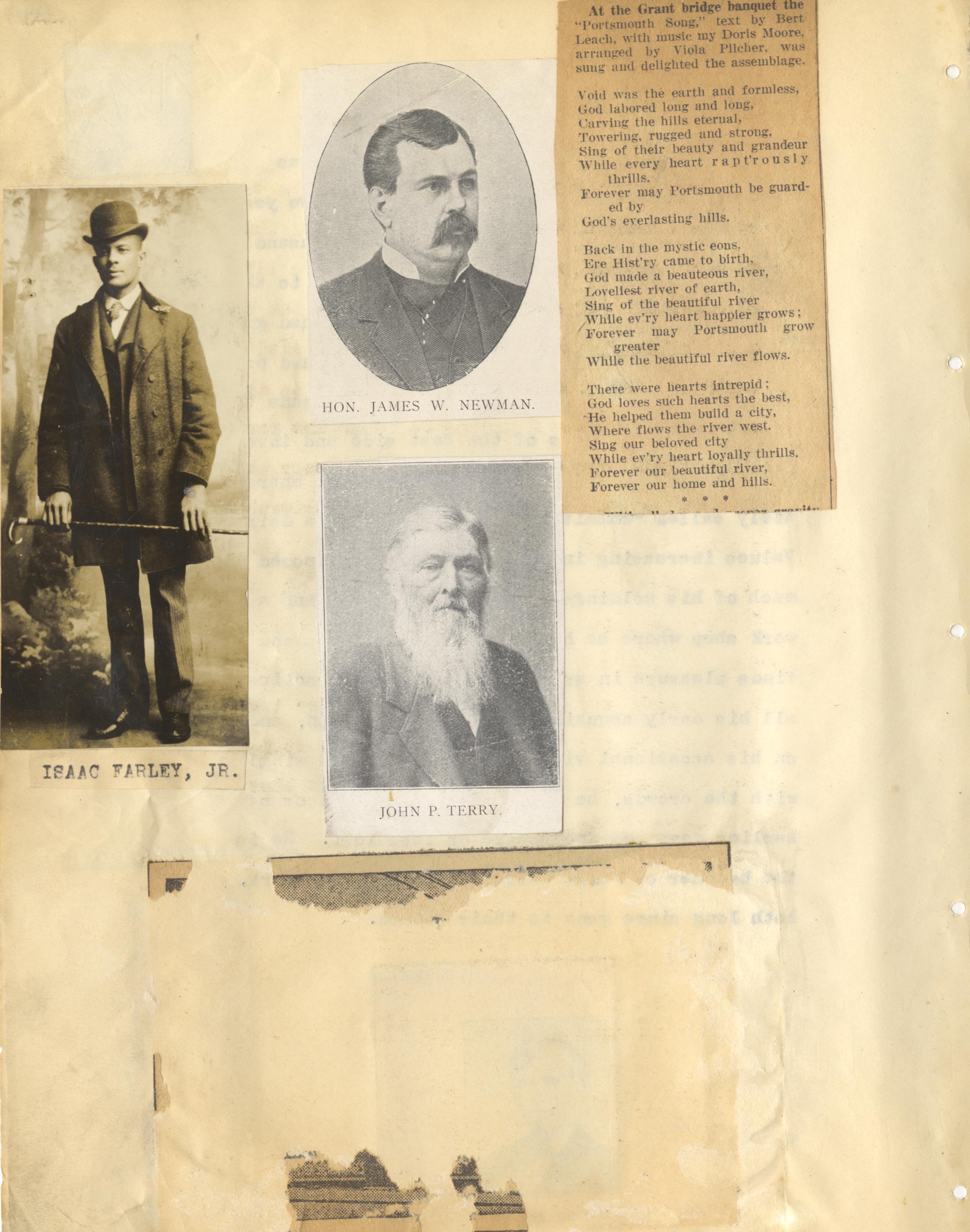 - Photo image of scanned scrapbook page. Pictured: Isaac Farley Jr.; Hon. James W. Newman; John P. Terry; Newspaper Article "At the Grant Bridge Banquet..."