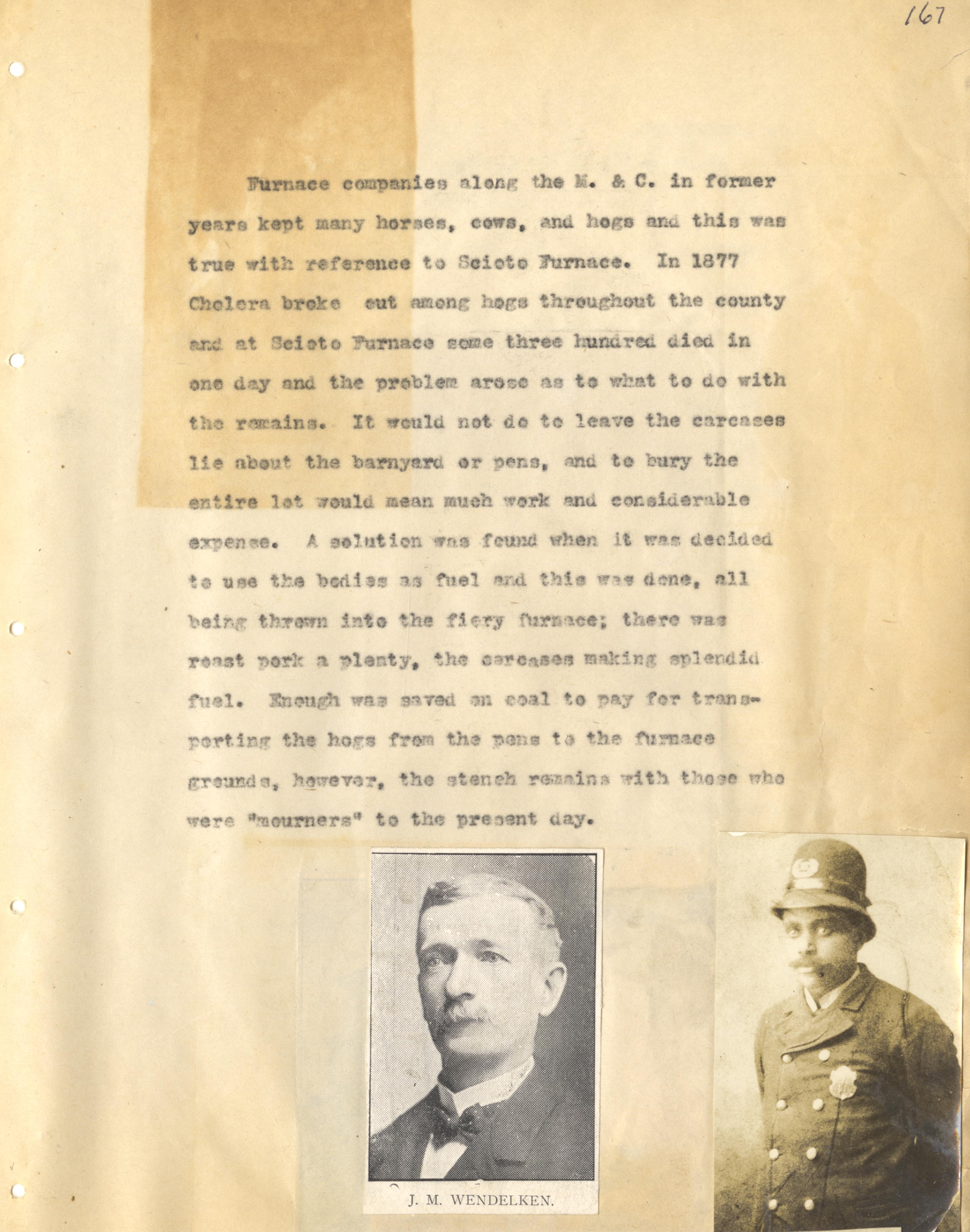 Henry A. Lorberg , “Hogs at the Furnace Companies along the M & C; J. M. Wendelken,” Scioto County Public Library Local History Digital Collection, accessed December 16, 2025, https://www.sciotolibrary.org/history/items/show/22630.