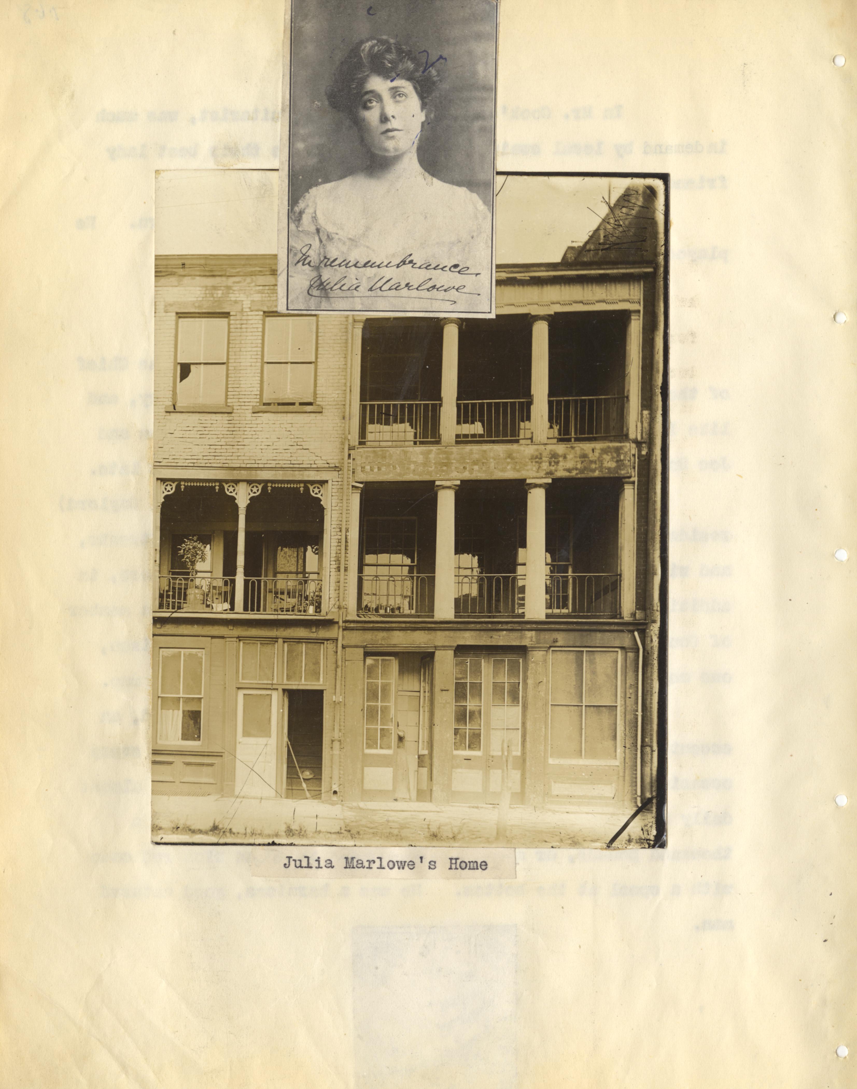 - Photo image of scanned scrapbook page. Pictured: Julia Marlowe and the home where she grew up
