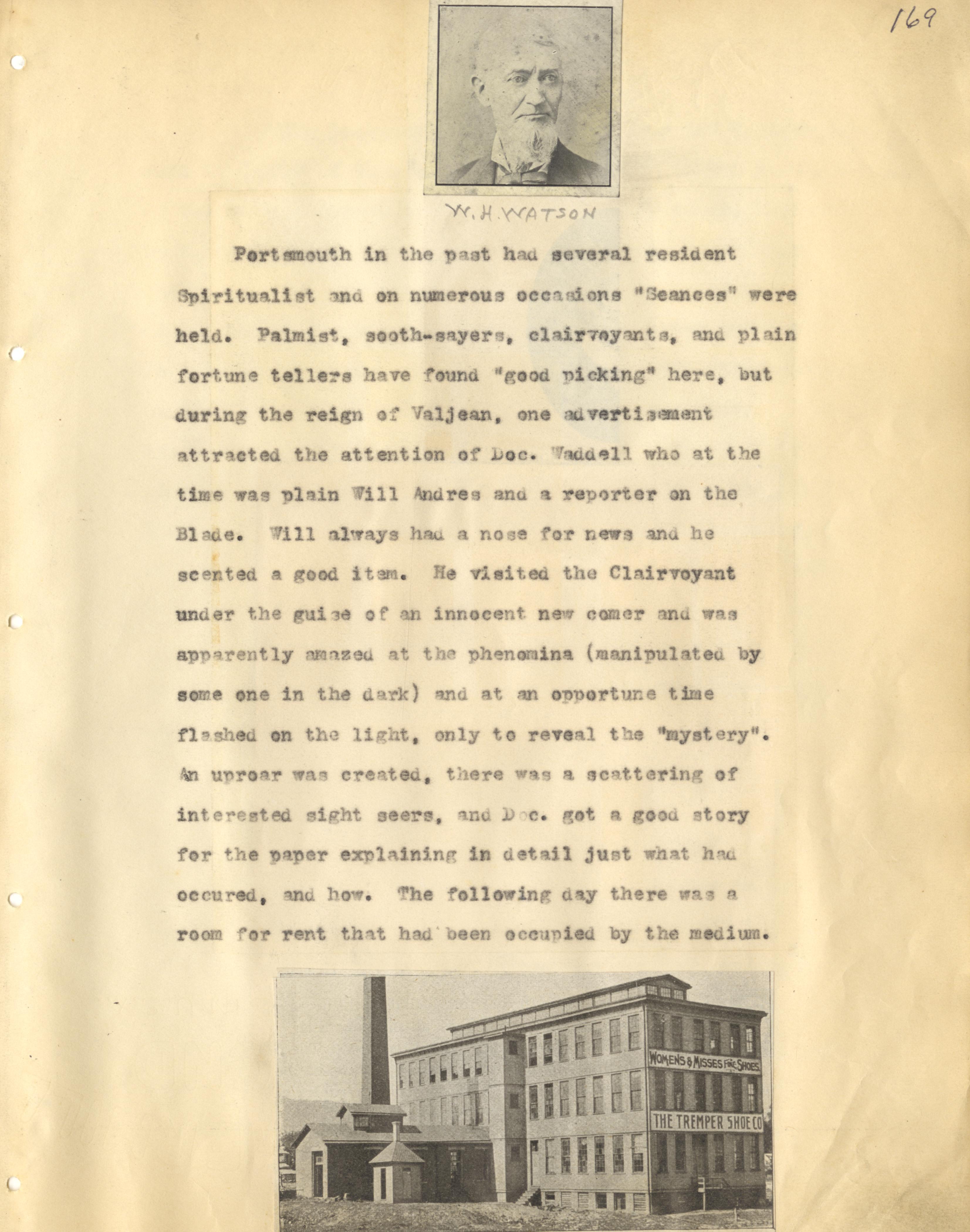 - Photo image of scanned scrapbook page. Pictured: W. H. Watson; typed page about Portsmouth Spiritualists; Tremper Shoe Company