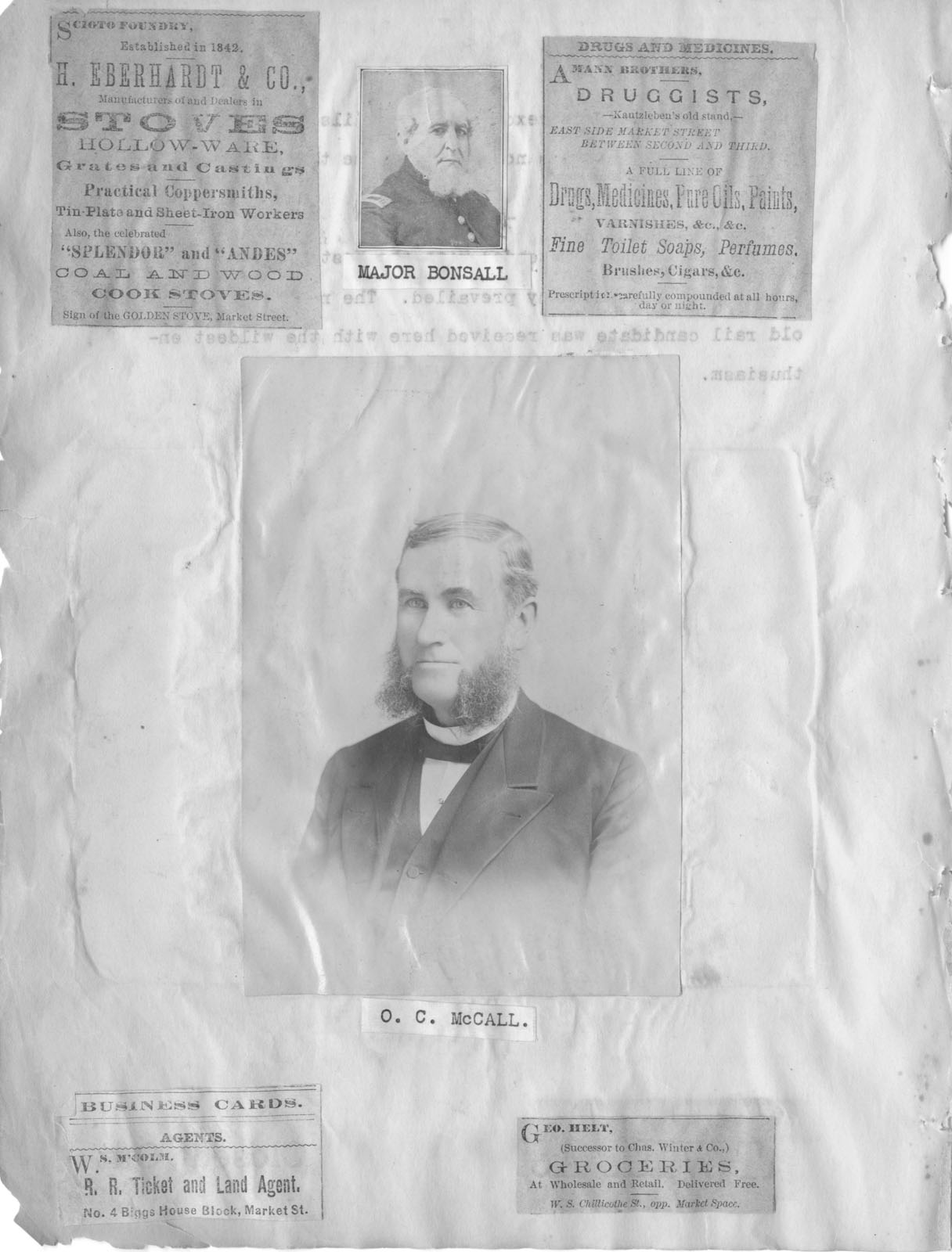 - Scanned unnumbered page from Henry A. Lorberg scrapbook containing black & white images of Major Bonsall and C. C. McCall. Clipped advertisements for Scioto Foundry, H. Eberhardt & Co., Stoves; Amann Brothers, Druggists; W. S. M'Colm, R. R. Ticket and Land agent; Geo. Helt, Groceries.