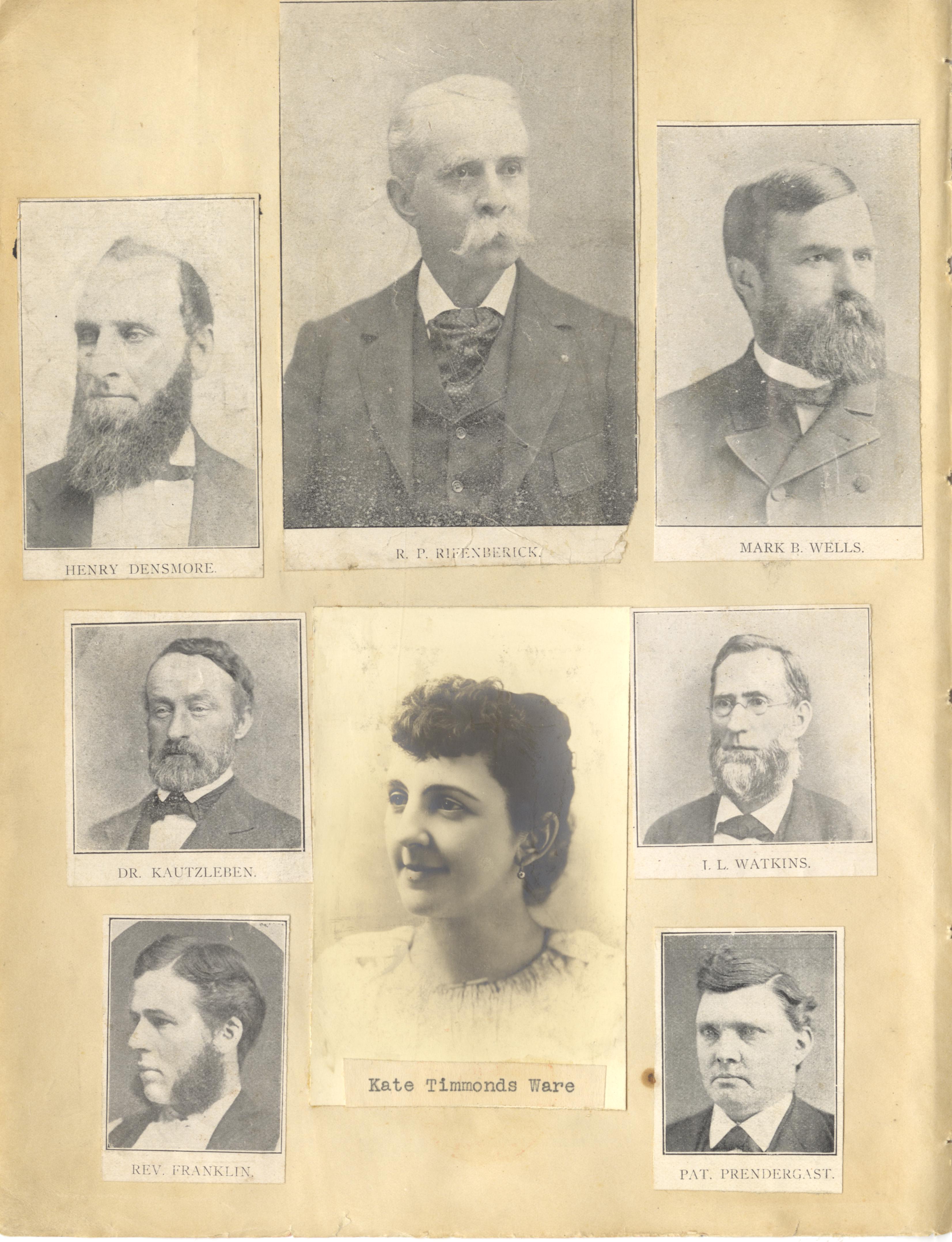 - Photo image of scanned scrapbook page. Pictured: Henry Densmore; R. P. Rifenberick; Mark B. Wells; Dr. Kauzleben; Rev. Franklin; Kate Timmonds Ware; L. L. Watkins; Pat Prendergast