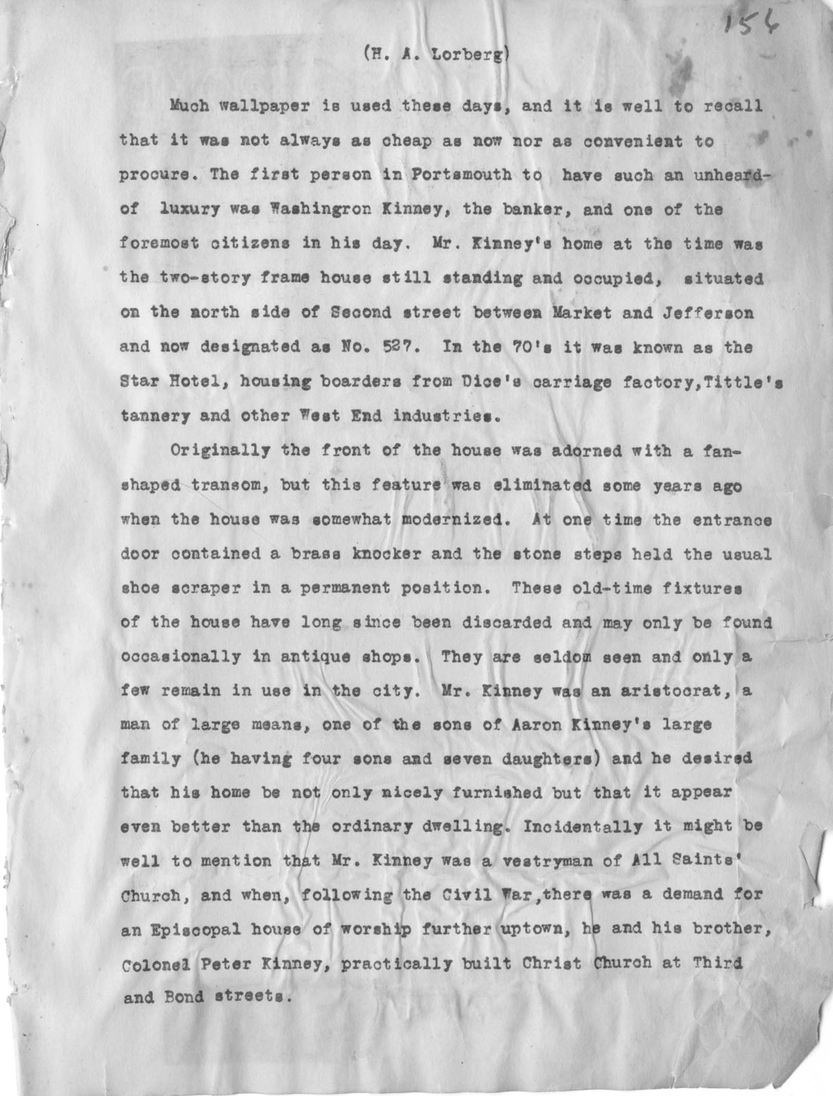 - Scanned page 156 from Henry A. Lorberg scrapbook containing typed text describing the homes of Washington Kinney.