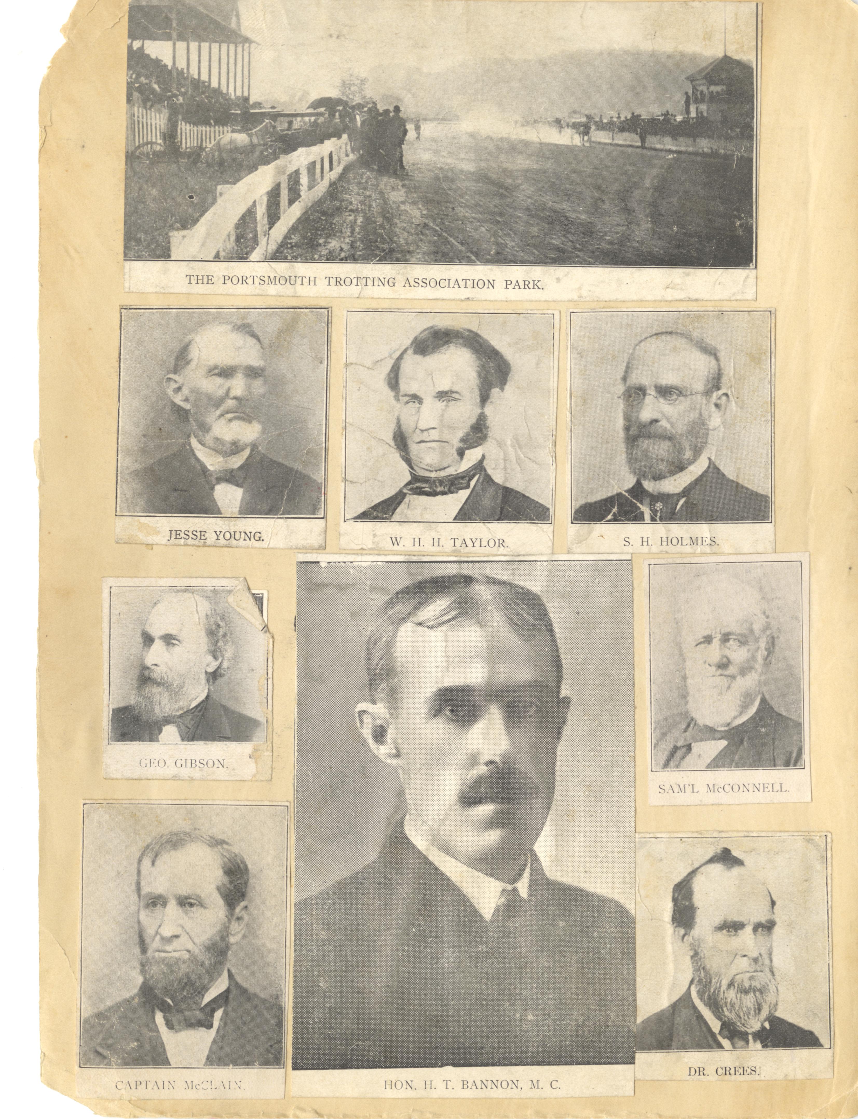 - Photo image of scanned scrapbook page. Pictured: Portsmouth Trotting Association Park; Jesse Young; W. H. H. Taylor; S. H. Holmes; George Gibson; Captain McClain; Hon. T. T. Bannon; M. C.; Dr. Crees; Samuel McConnell