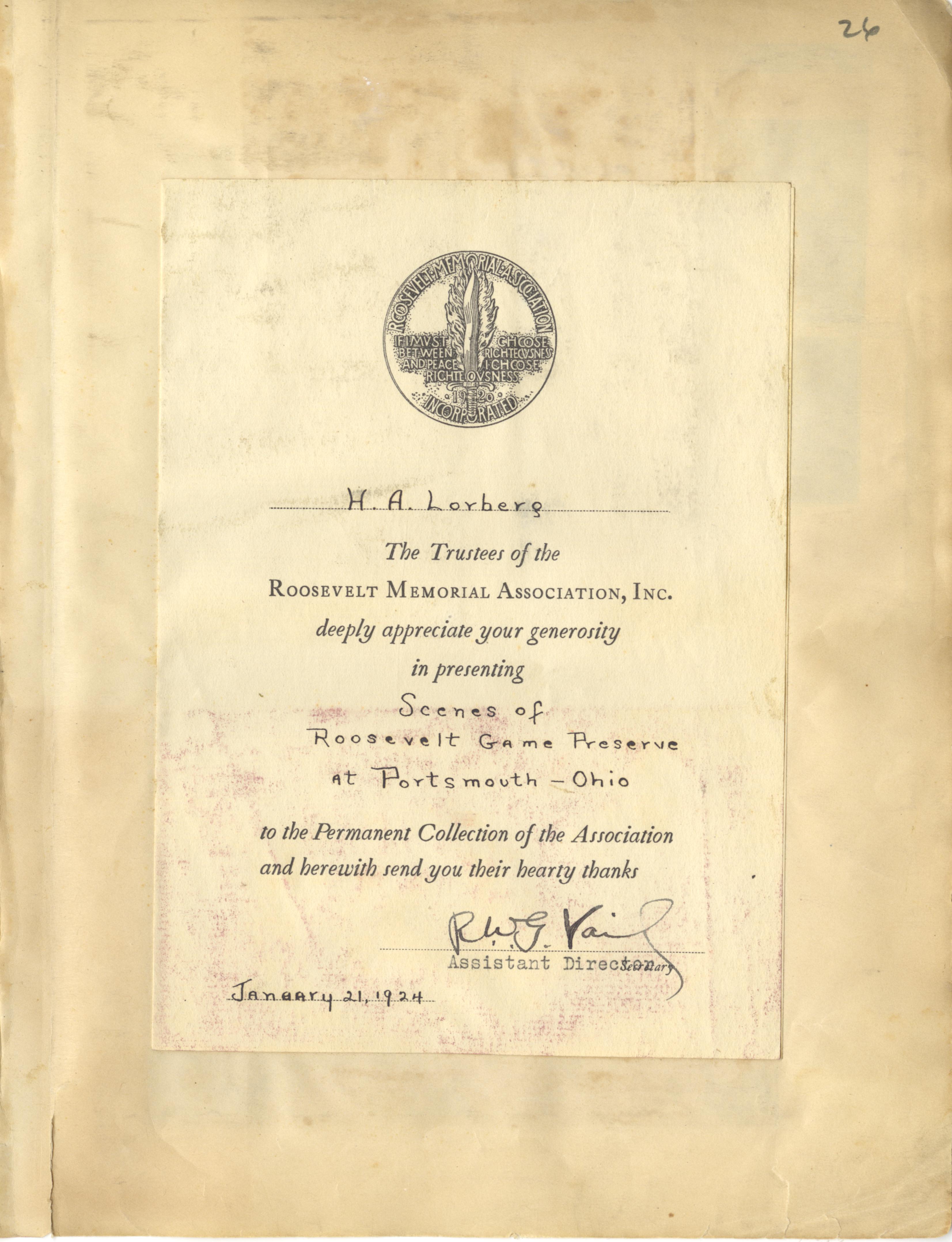 - Photo image of certificate from the Trustees of the Roosevelt Memorial Association to Henry A. Lorberg